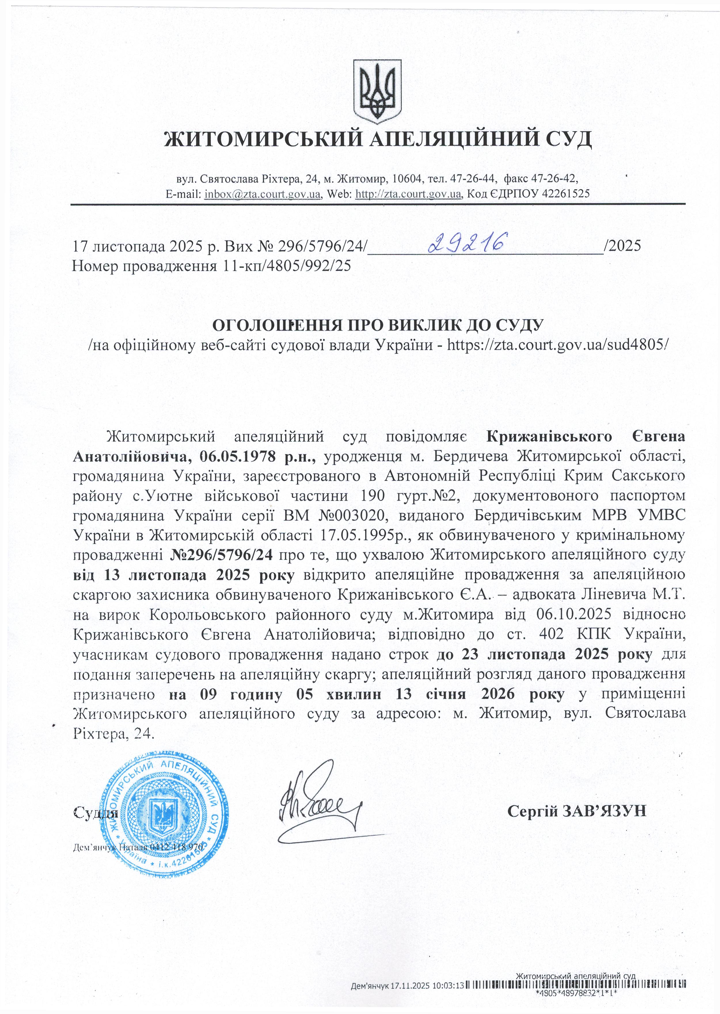 Житомирський апеляційний суд повідомляє про судове засідання по справі № 296/5796/24