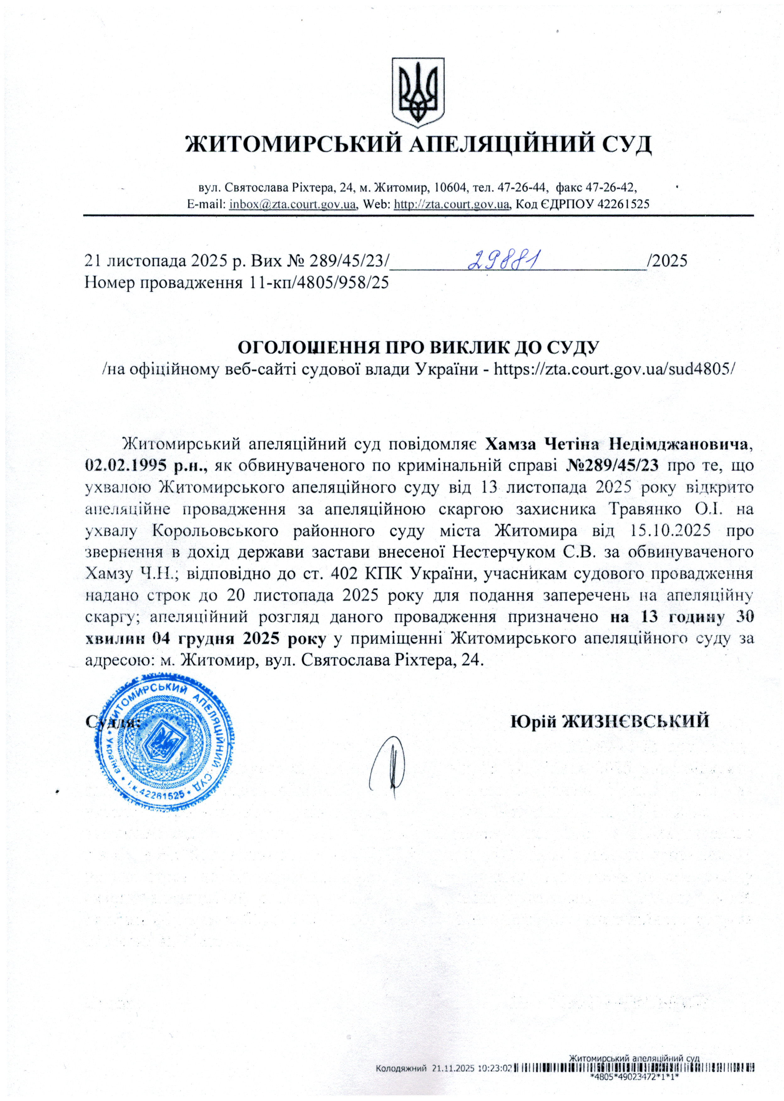 Житомирський апеляційний суд повідомляє про судове засідання по справі № 289/45/23