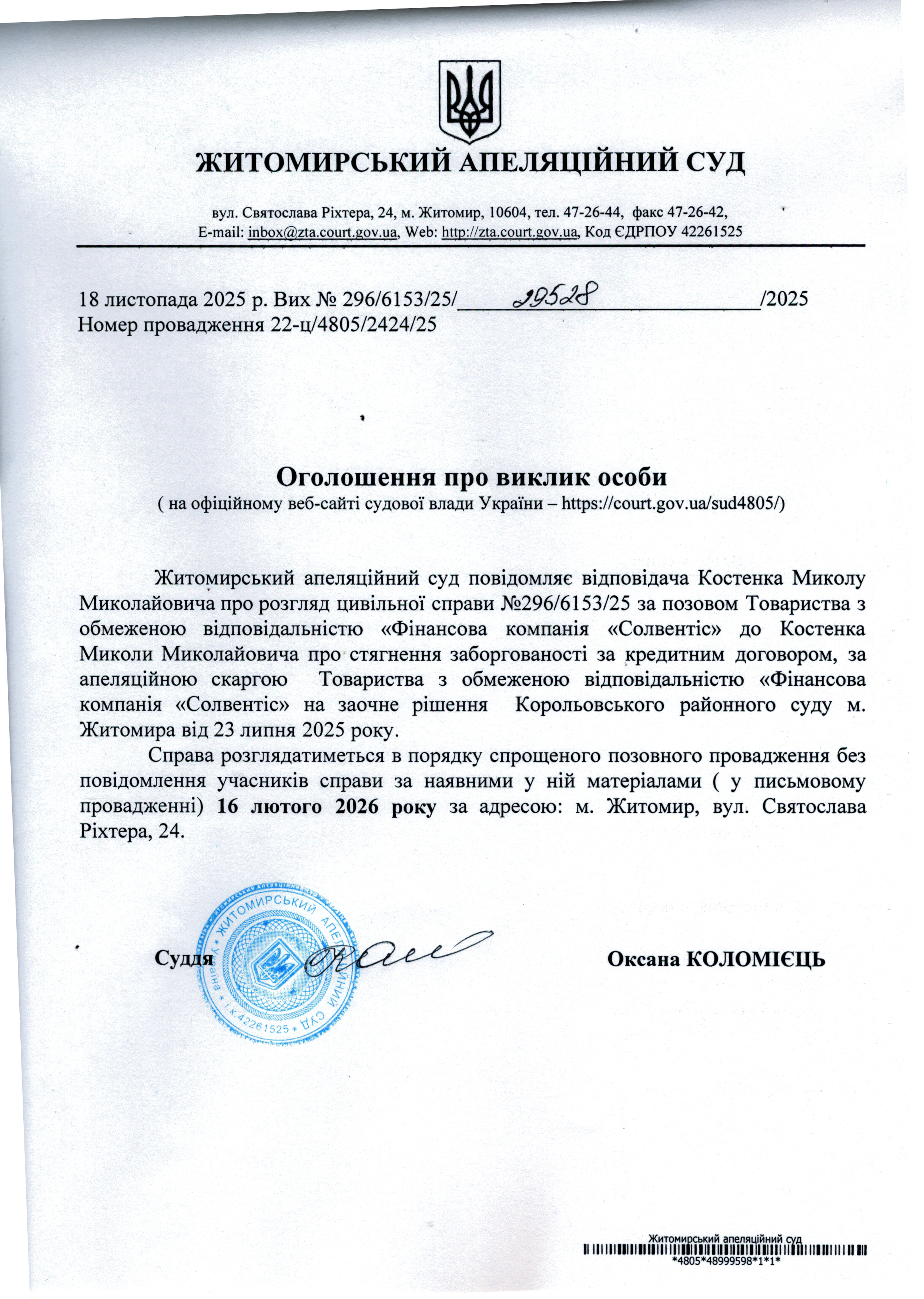 Житомирський апеляційний суд повідомляє про судове засідання по справі № 296/6153/25