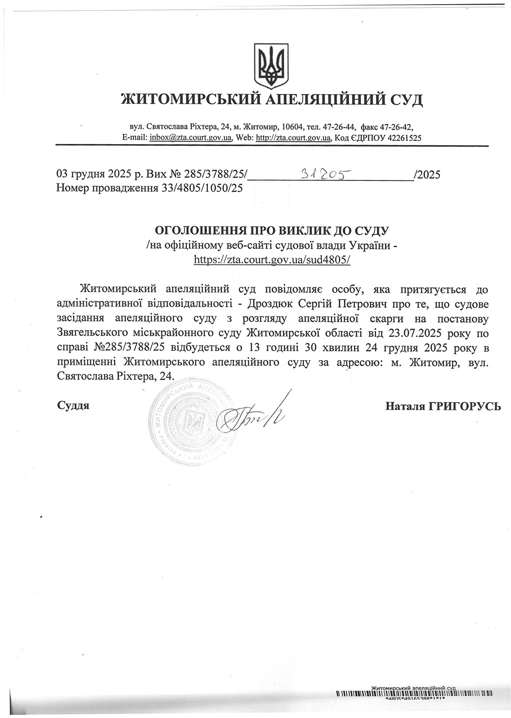 Житомирський апеляційний суд повідомляє про судове засідання по справі №285/3788/25