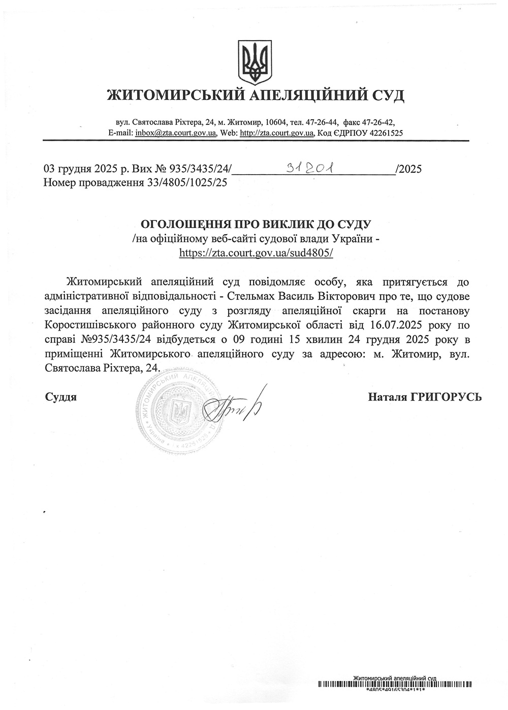 Житомирський апеляційний суд повідомляє про судове засідання по справі № 935/3435/24