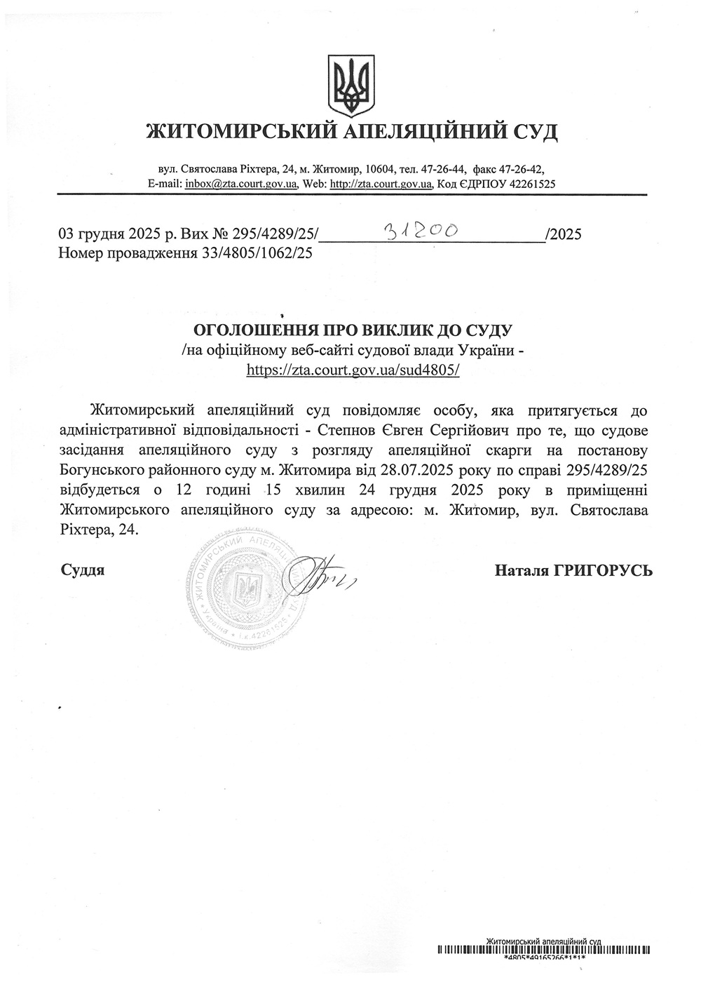 Житомирський апеляційний суд повідомляє про судове засідання по справі №295/4289/25