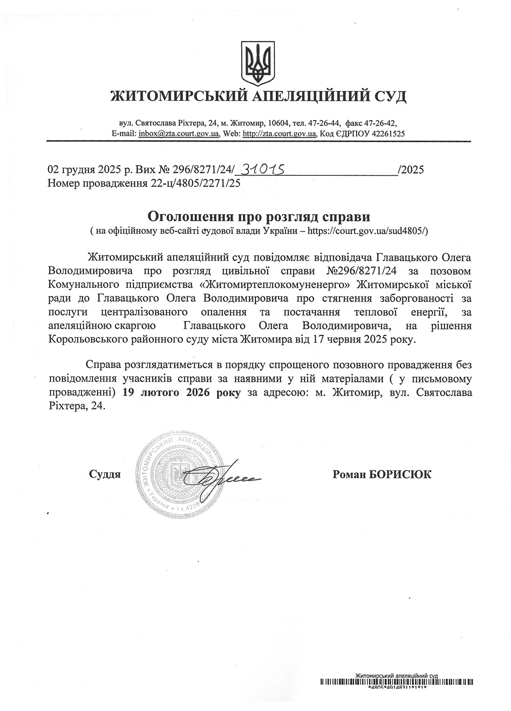 Житомирський апеляційний суд повідомляє про судове засідання по справі №296/8271/24