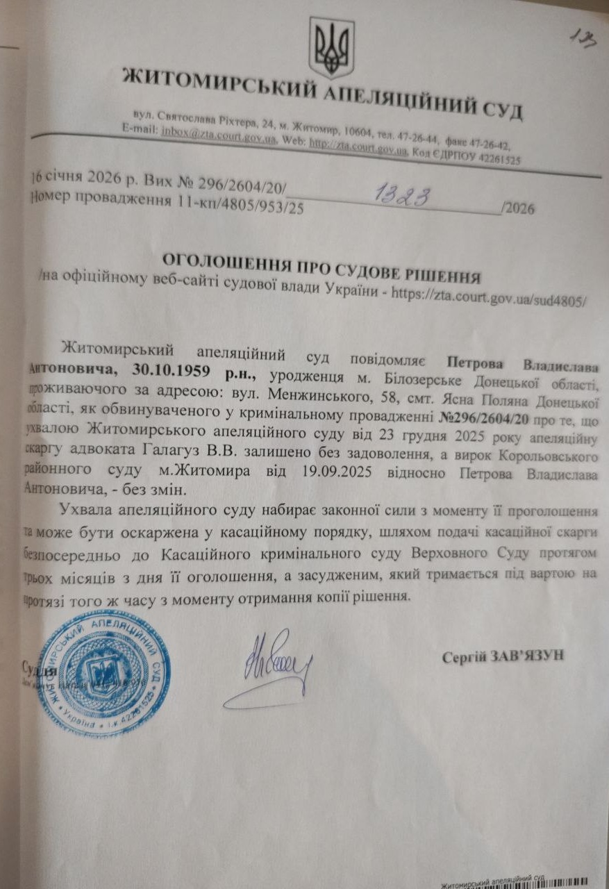 Житомирський апеляційний суд повідомляє про судове засідання по справі №296/2604/20