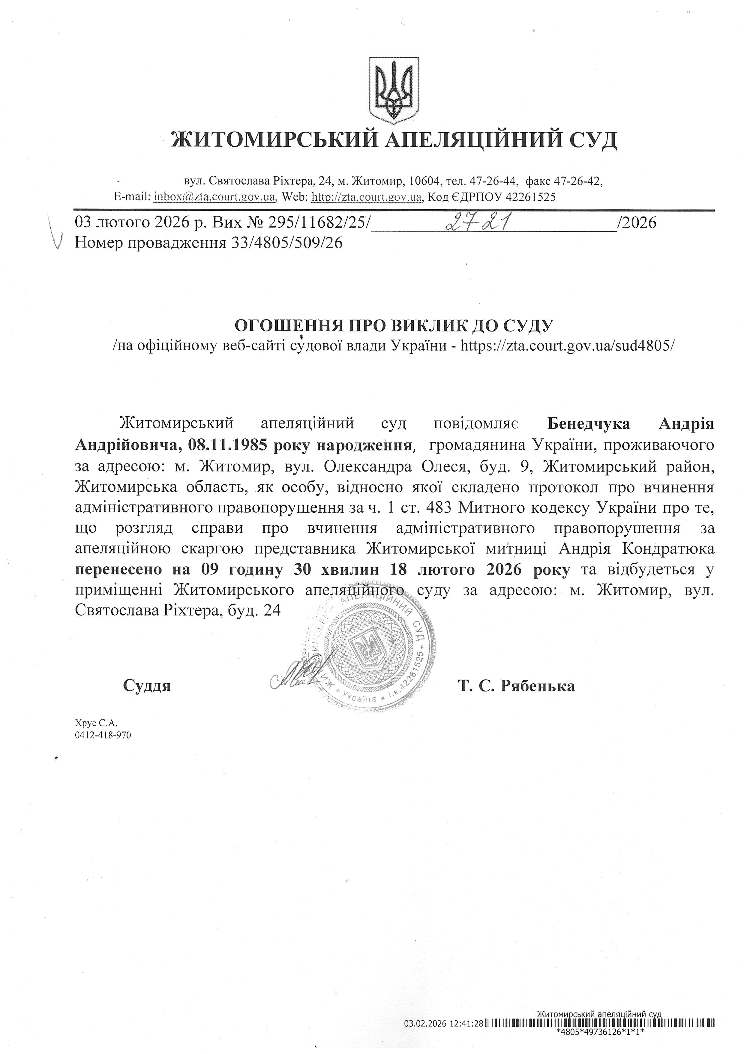 Житомирський апеляційний суд повідомляє про судове засідання по справі №295/11682/25