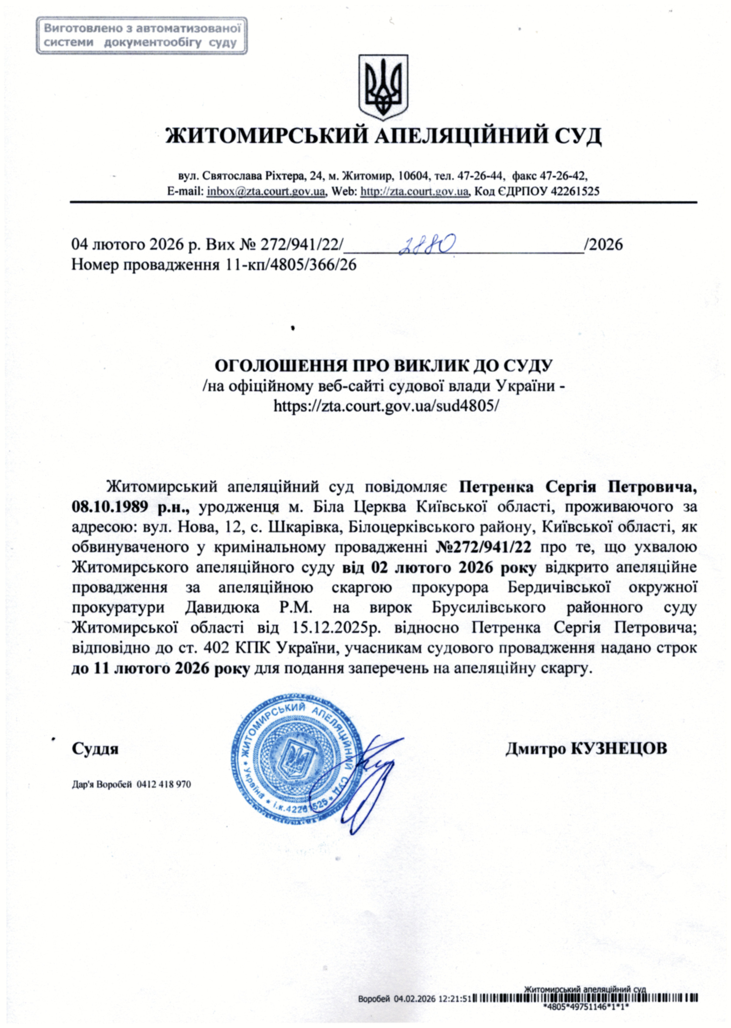 Житомирський апеляційний суд повідомляє про судове засідання по справі № 272/941/22