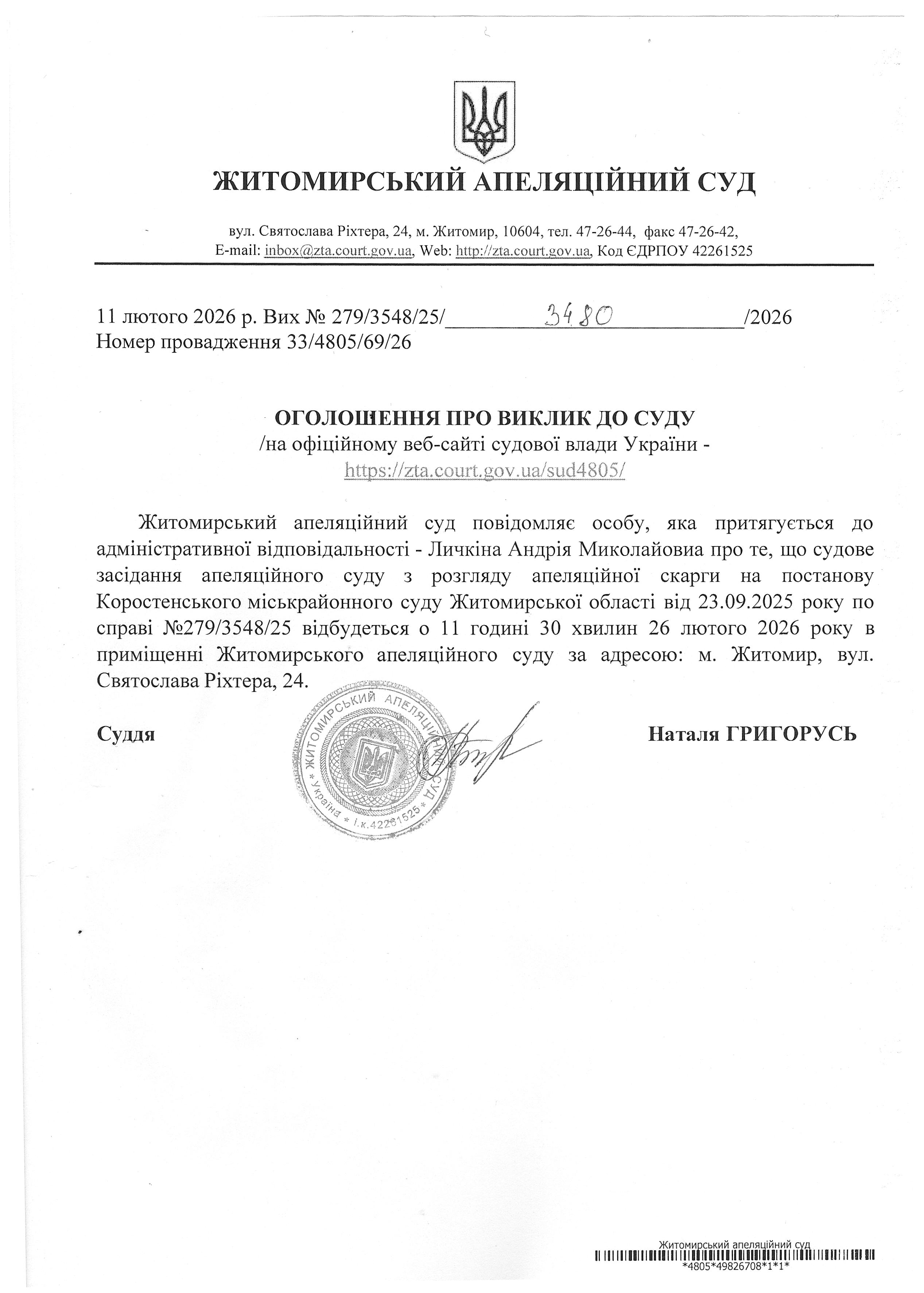 Житомирський апеляційний суд повідомляє про судове засідання по справі №279/3548/25