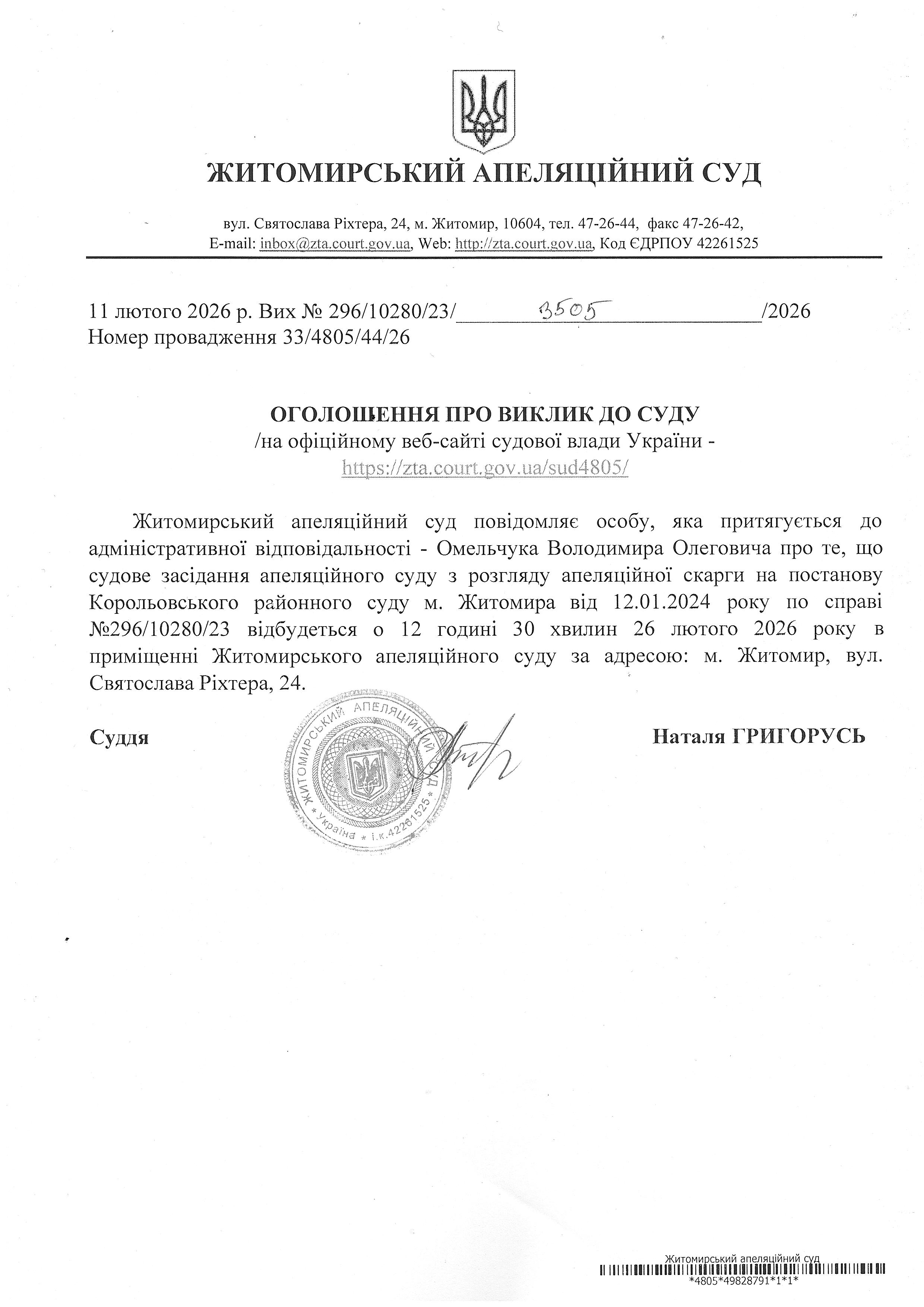 Житомирський апеляційний суд повідомляє про судове засідання по справі №296/10280/23