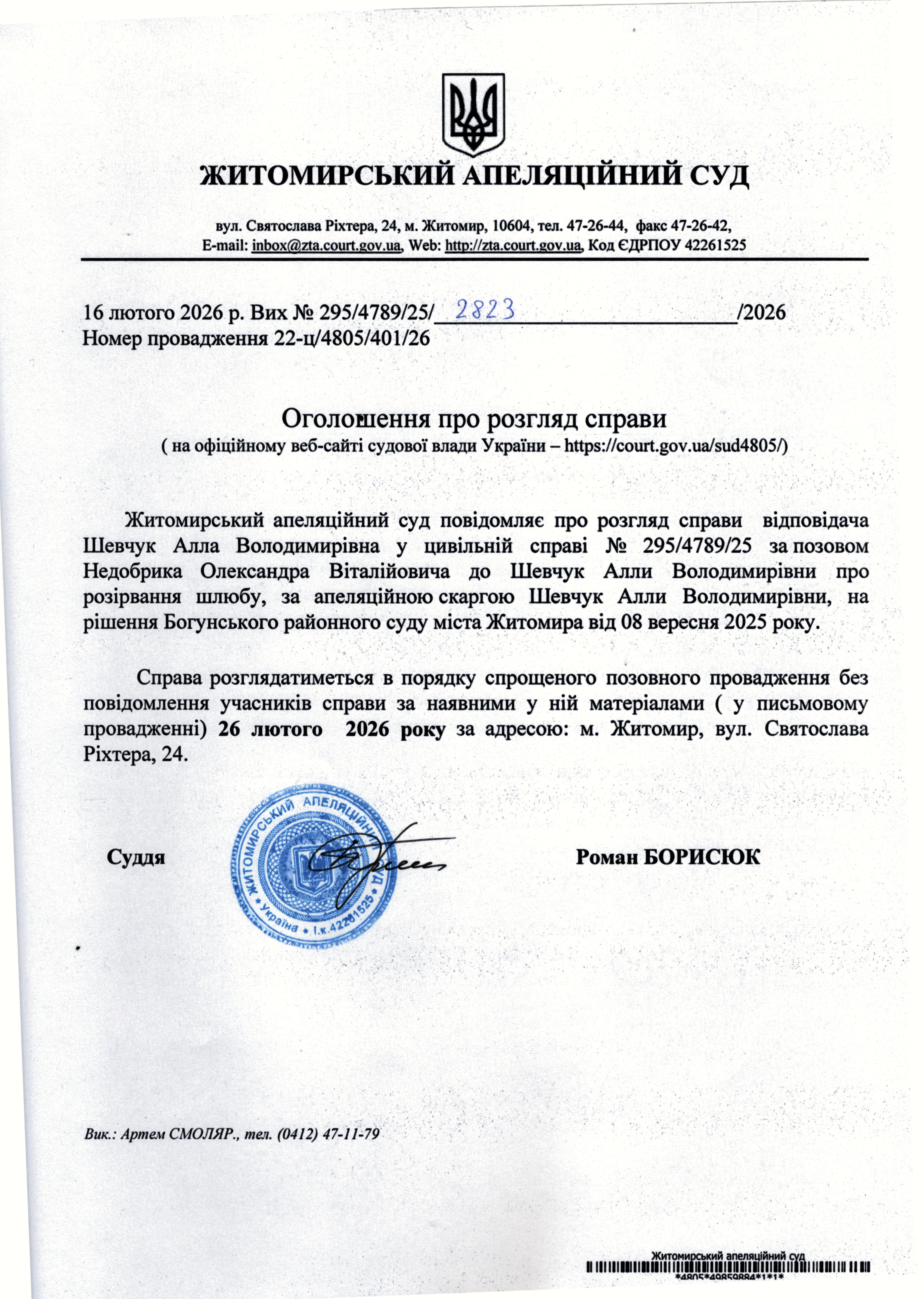 Житомирський апеляційний суд повідомляє про судове засідання по справі № 295/4789/25