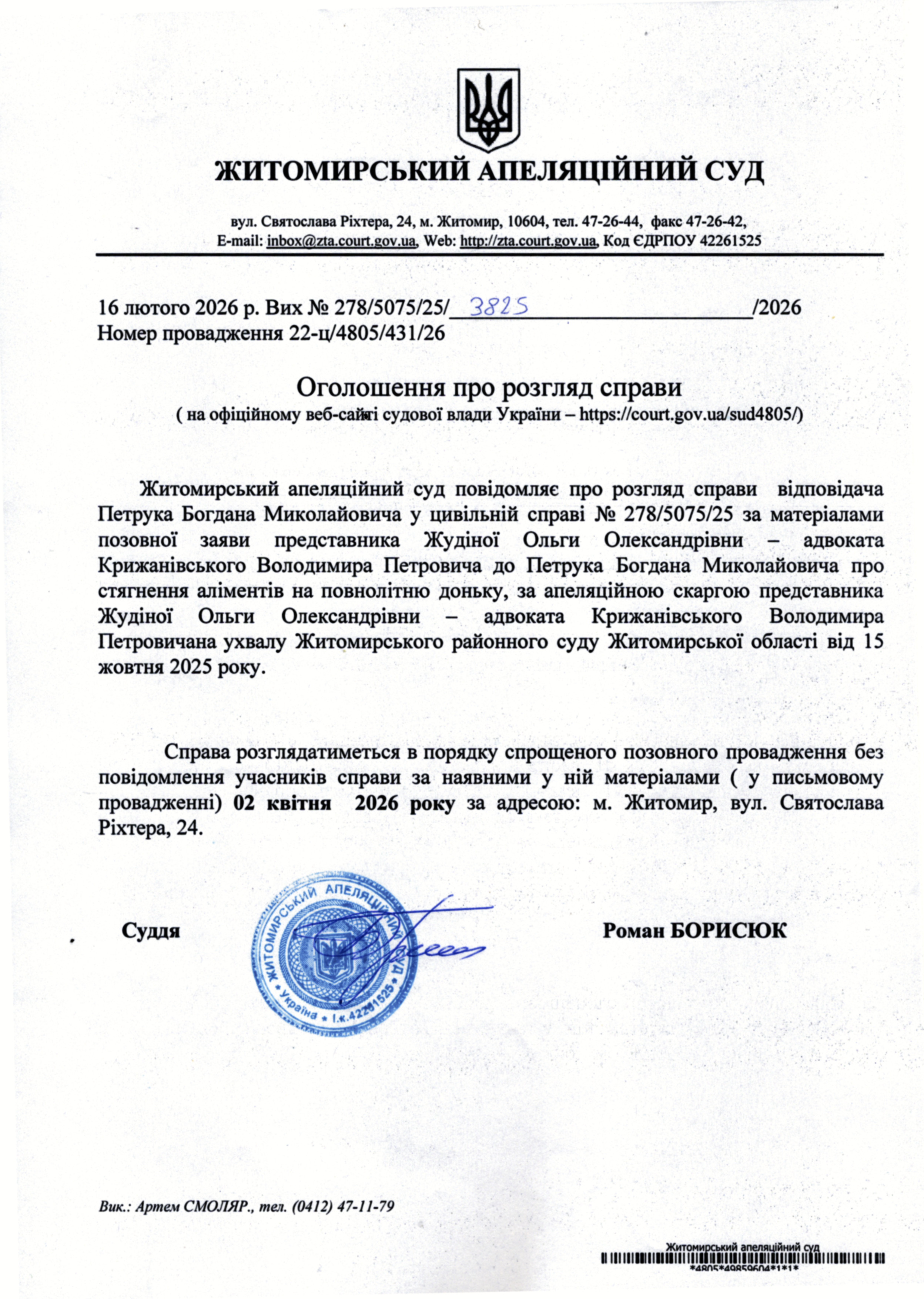 Житомирський апеляційний суд повідомляє про судове засідання по справі № 278/5075/25