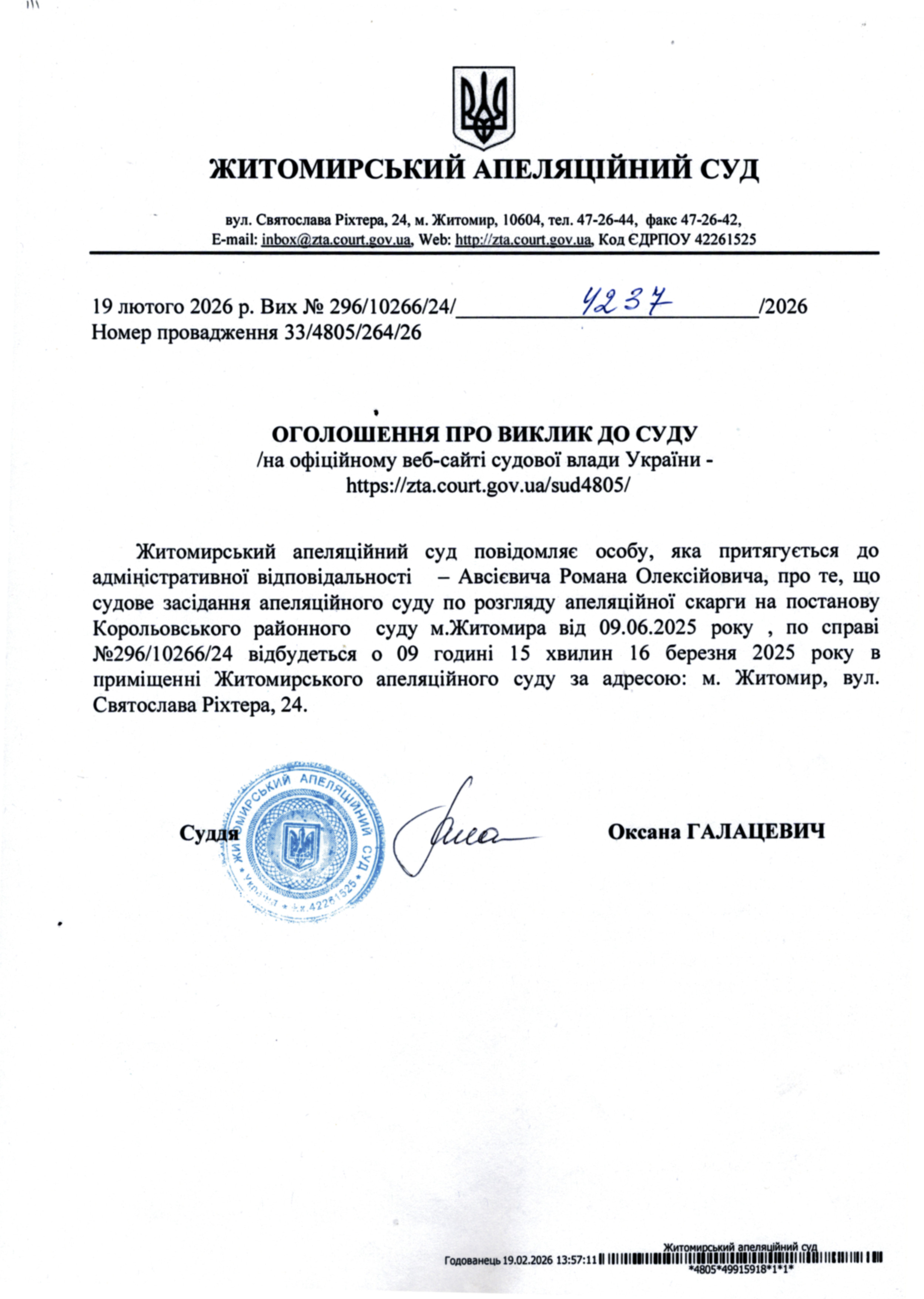 Житомирський апеляційний суд повідомляє про судове засідання по справі № 296/10266/24