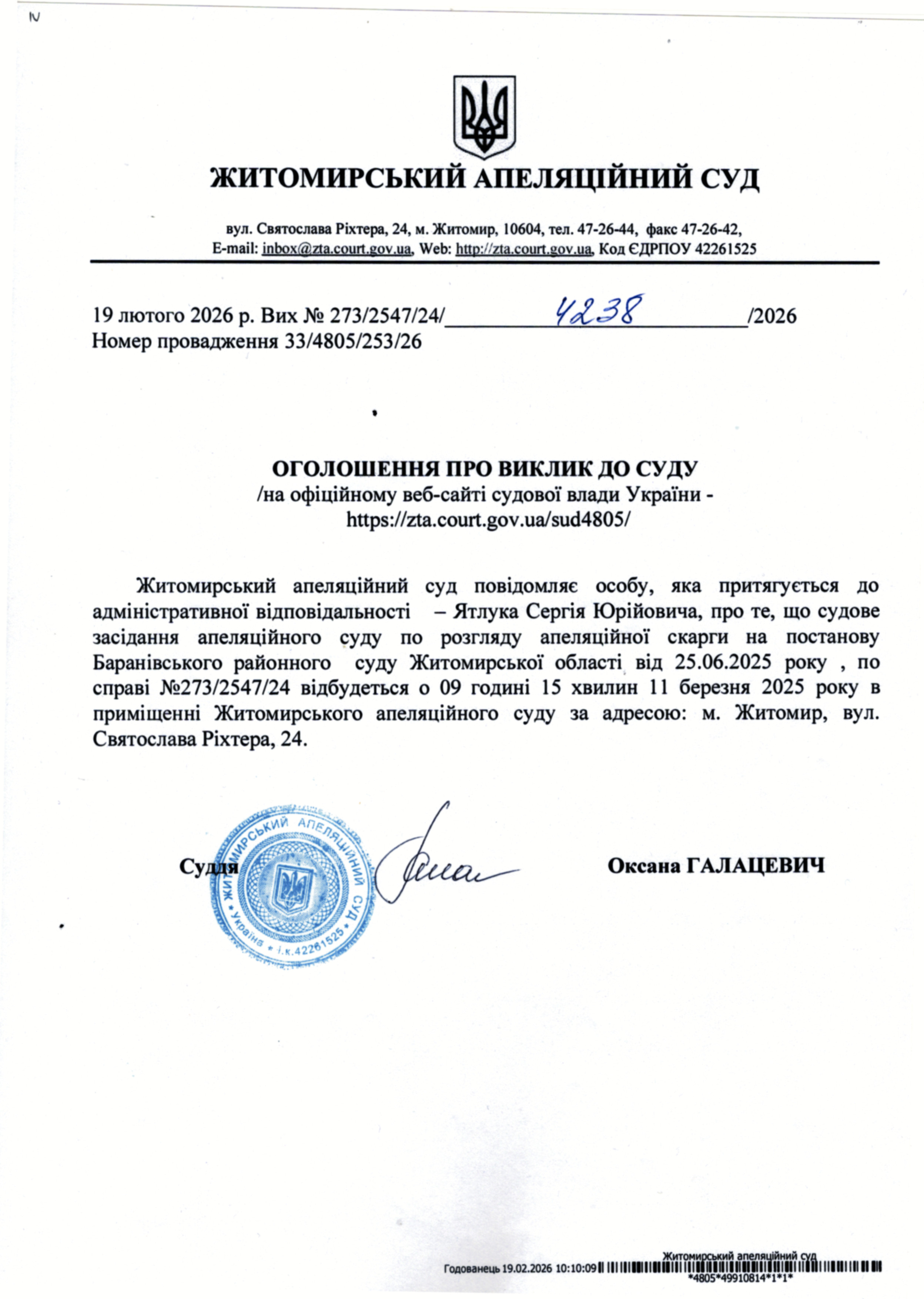 Житомирський апеляційний суд повідомляє про судове засідання по справі № 273/2547/24
