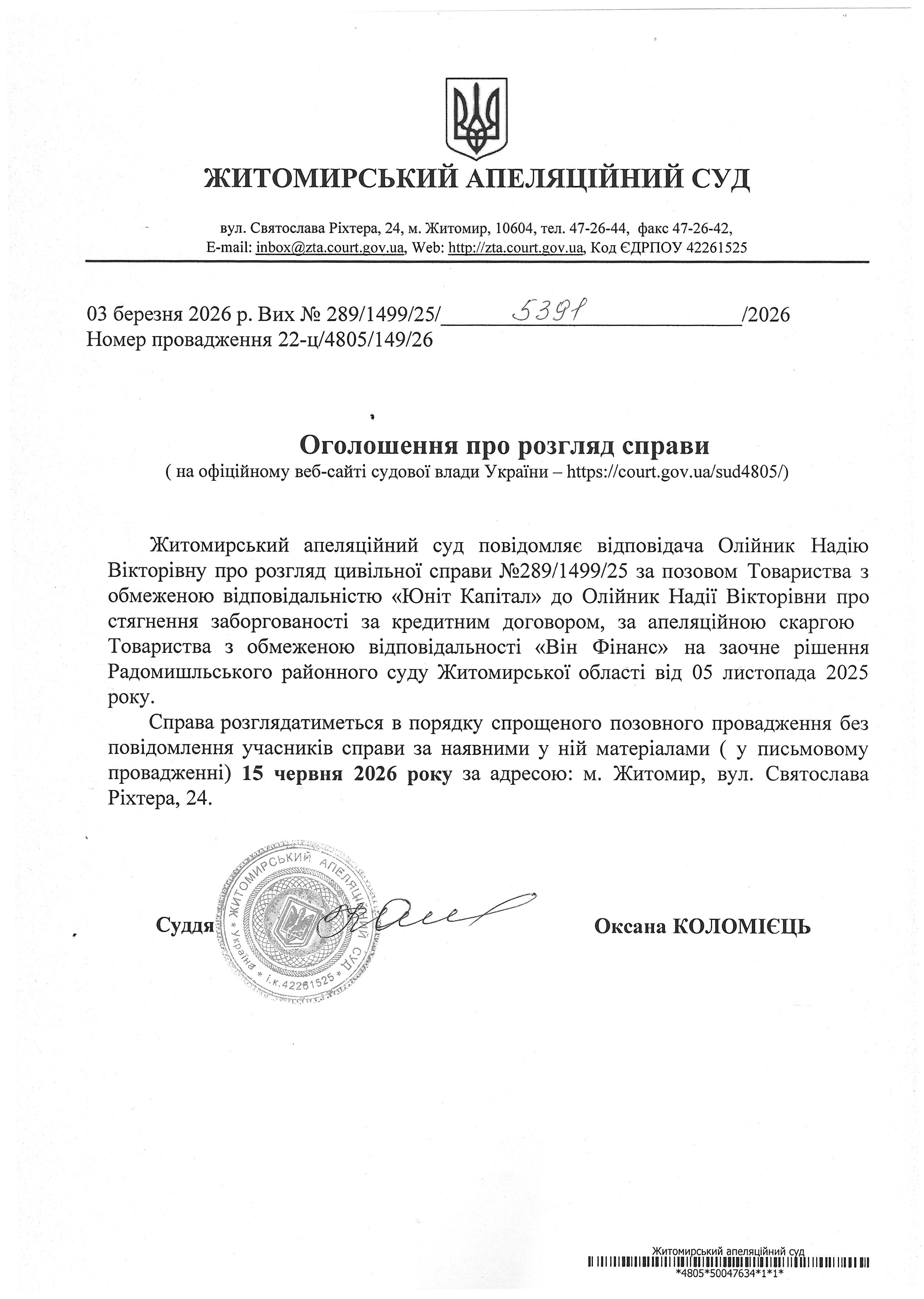 Житомирський апеляційний суд повідомляє про судове засідання по справі №289/1499/25