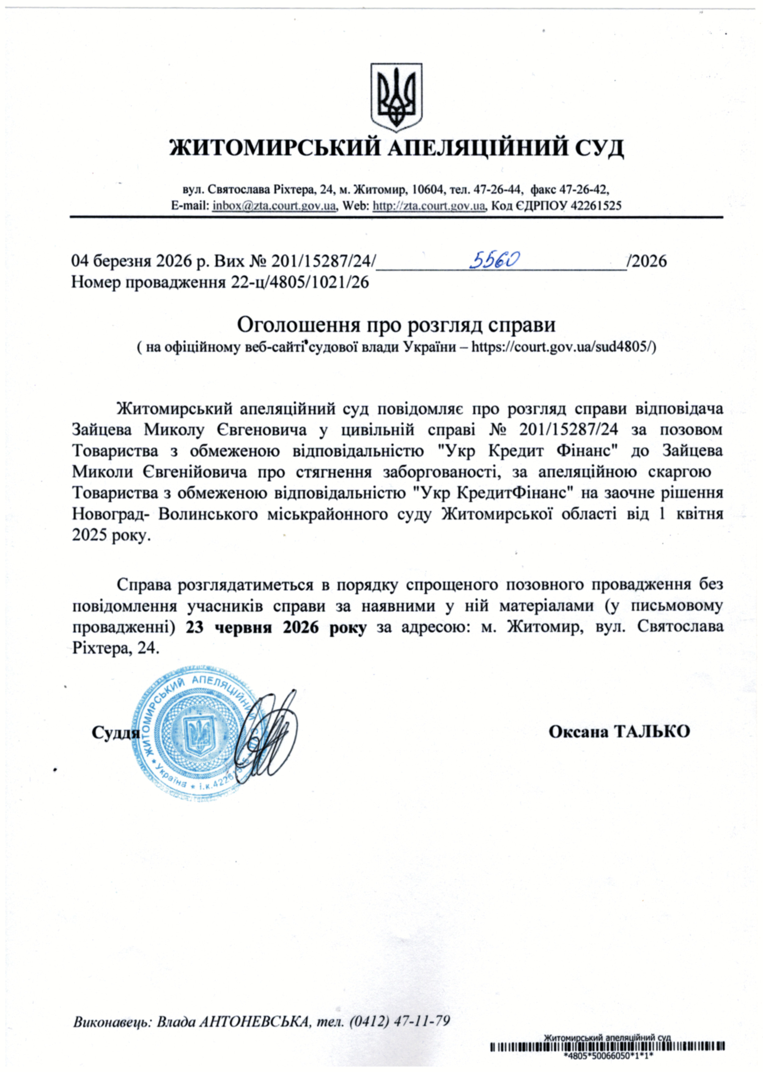 Житомирський апеляційний суд повідомляє про судове засідання по справі № 201/15287/24