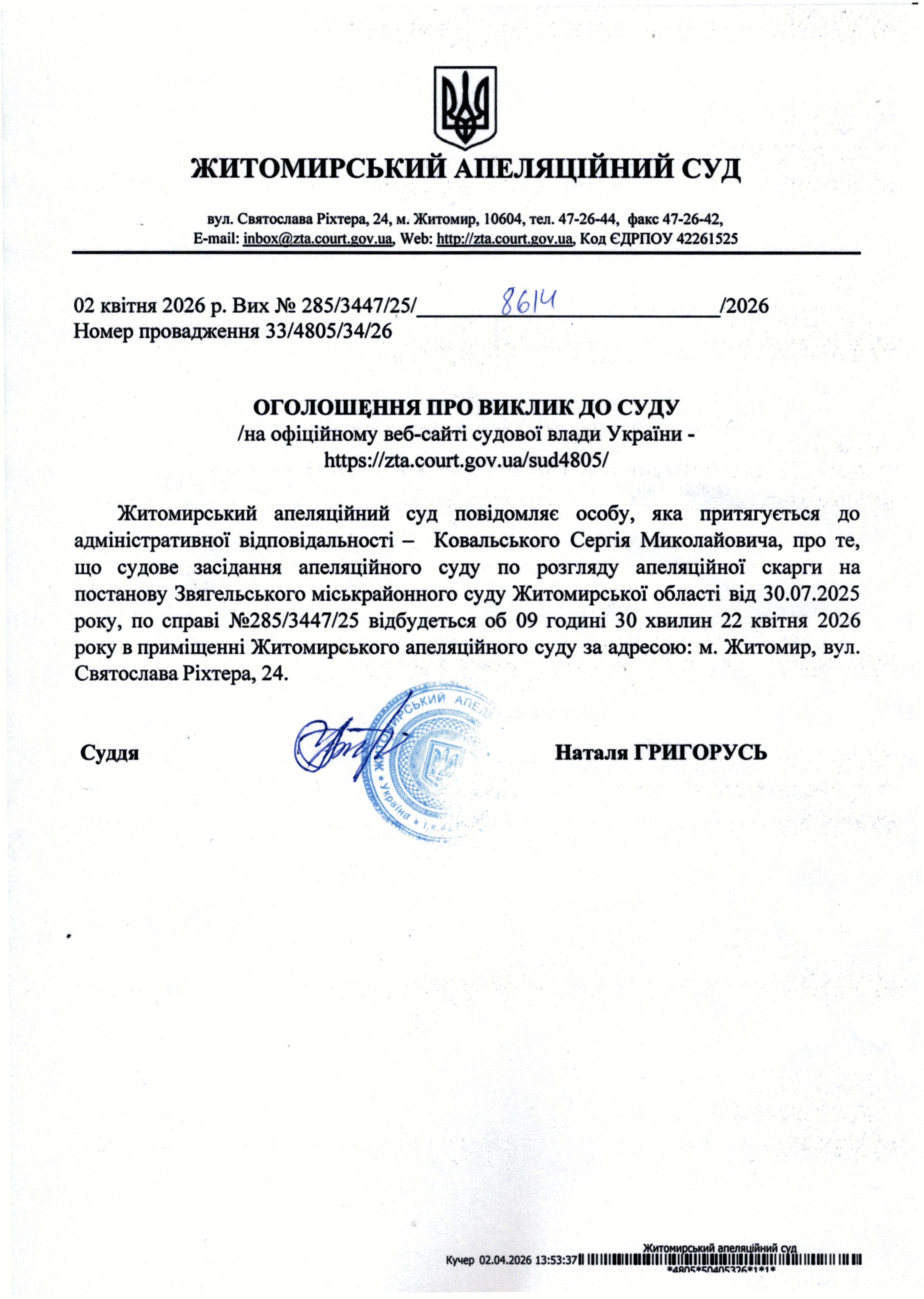 Житомирський апеляційний суд повідомляє про судове засідання по справі № 285/3447/25