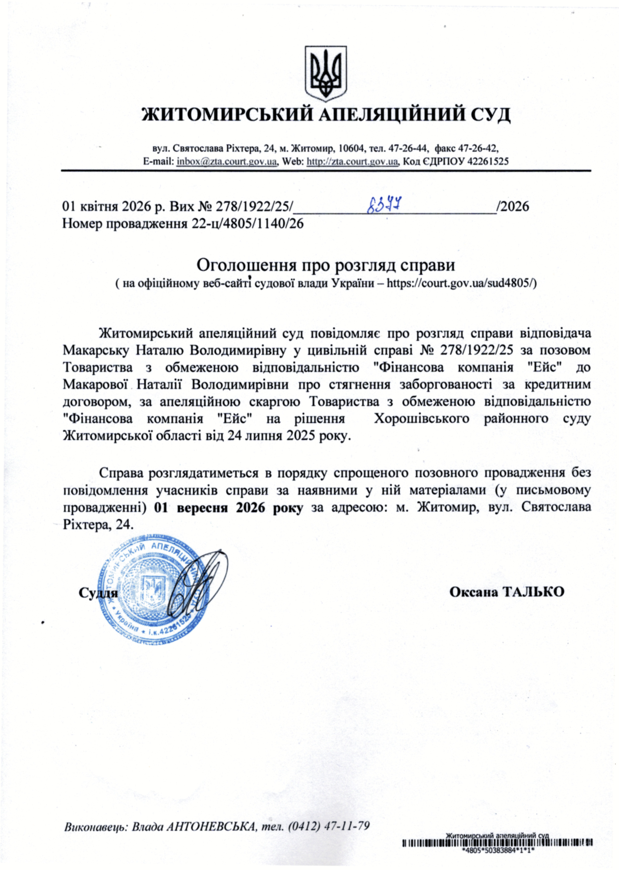 Житомирський апеляційний суд повідомляє про судове засідання по справі № 278/1922/25