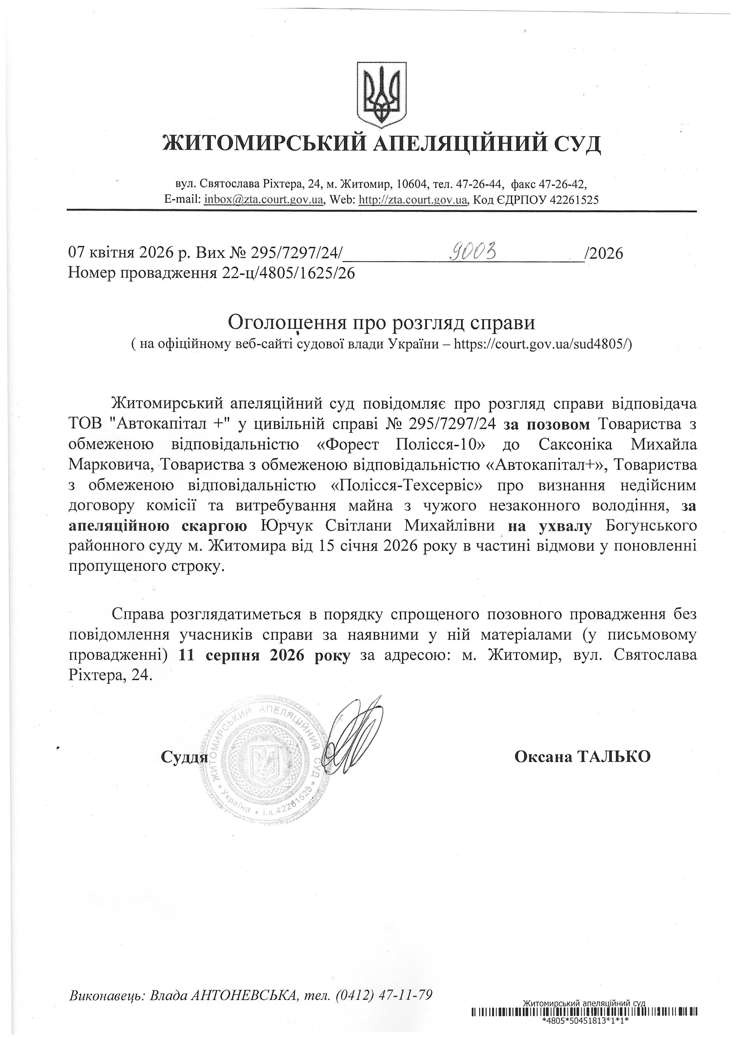Житомирський апеляційний суд повідомляє про судове засідання по справі №295/7297/24