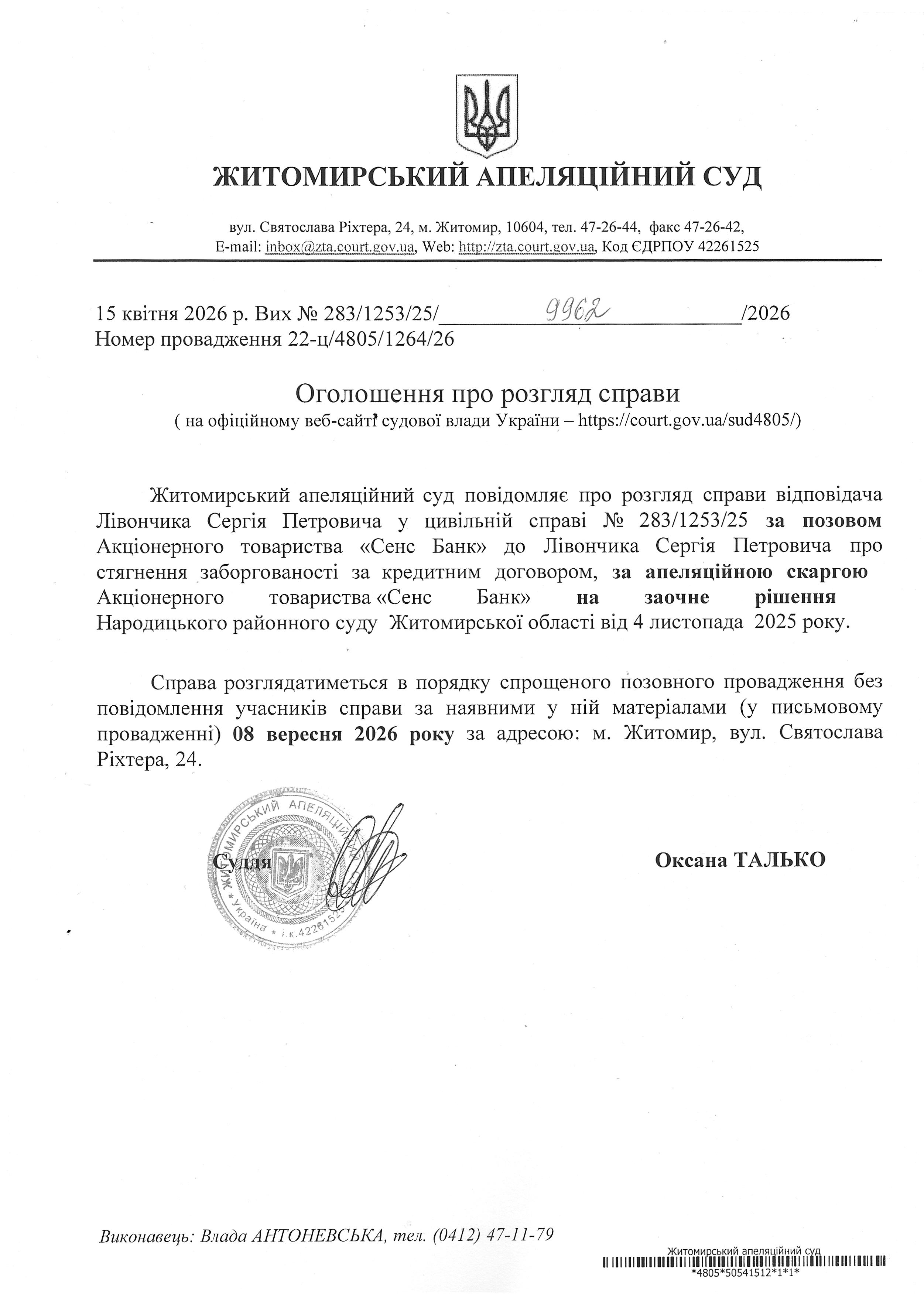 Житомирський апеляційний суд повідомляє про судове засідання по справі №283/1253/25