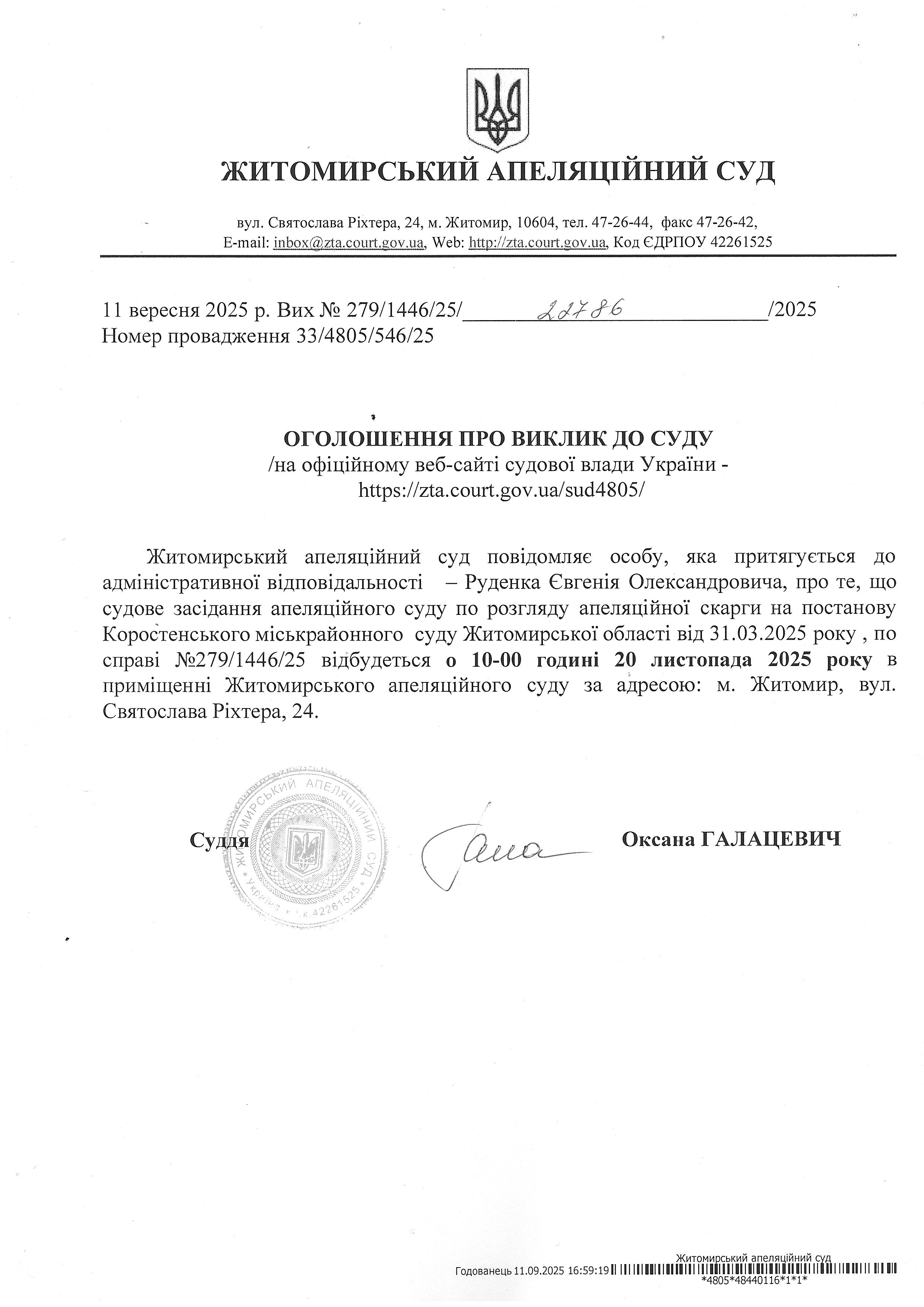 Житомирський апеляційний суд повідомляє про судове засідання по справі № 279/1446/25