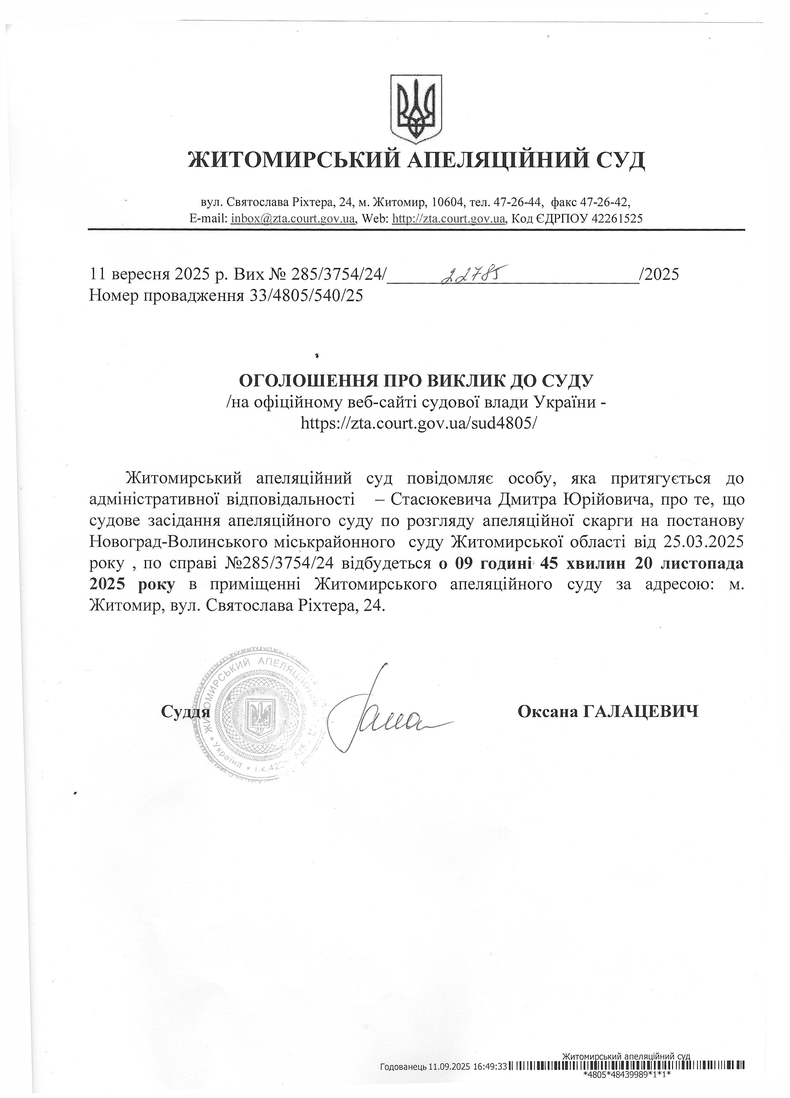 Житомирський апеляційний суд повідомляє про судове засідання по справі № 285/3754/24