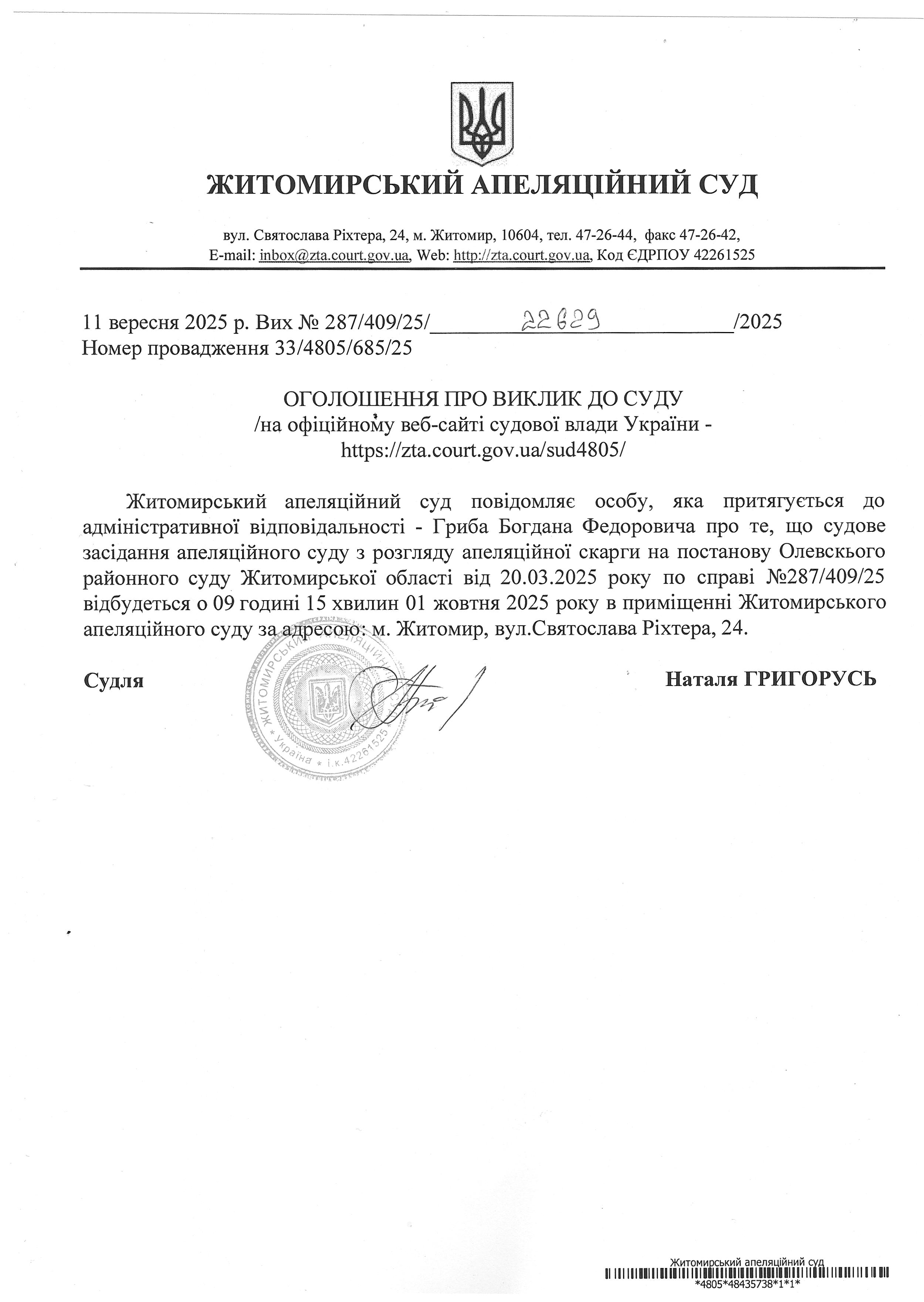 Житомирський апеляційний суд повідомляє про судове засідання по справі № 287/409/25
