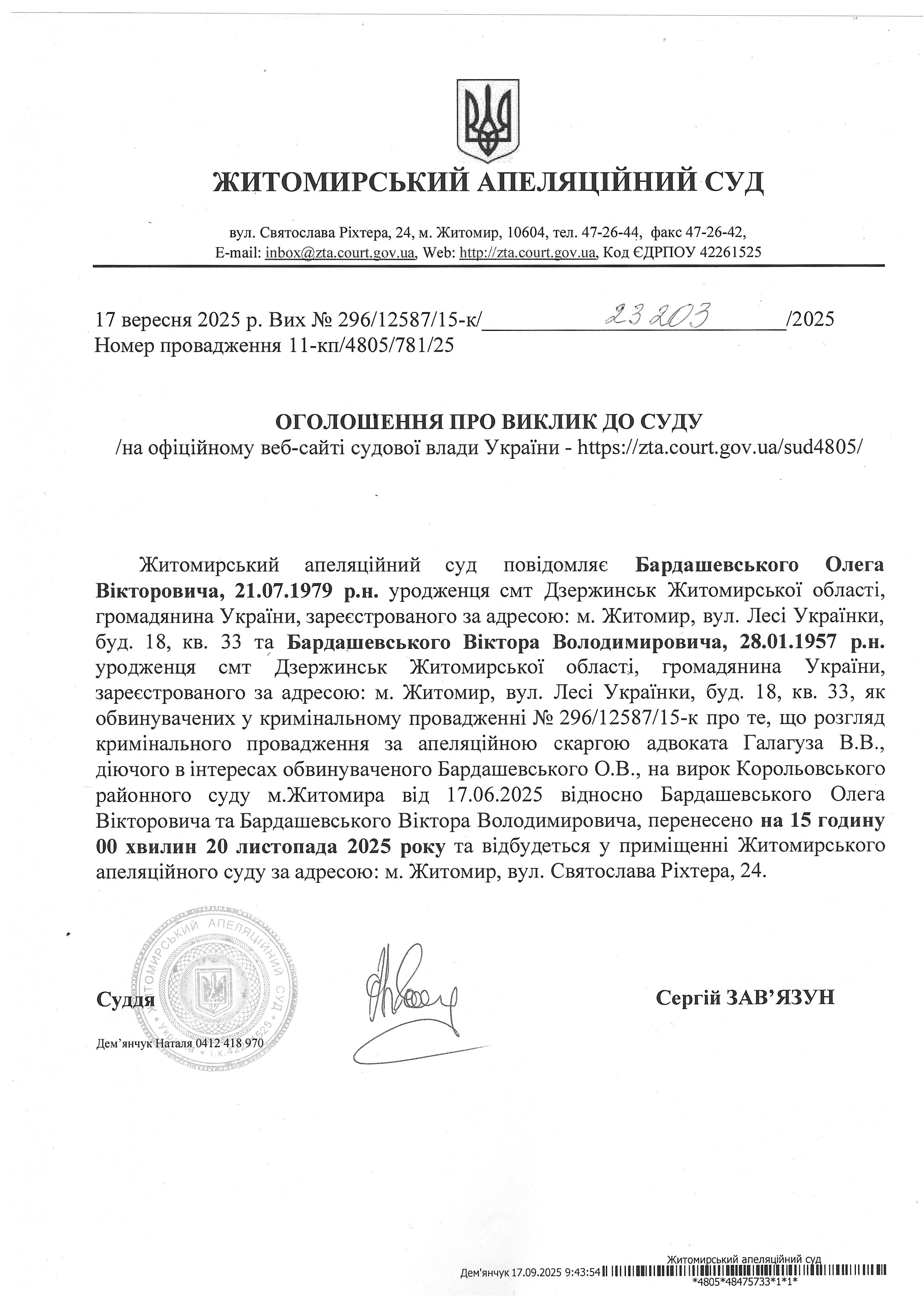 Житомирський апеляційний суд повідомляє про судове засідання по справі № 296/12587/15-к