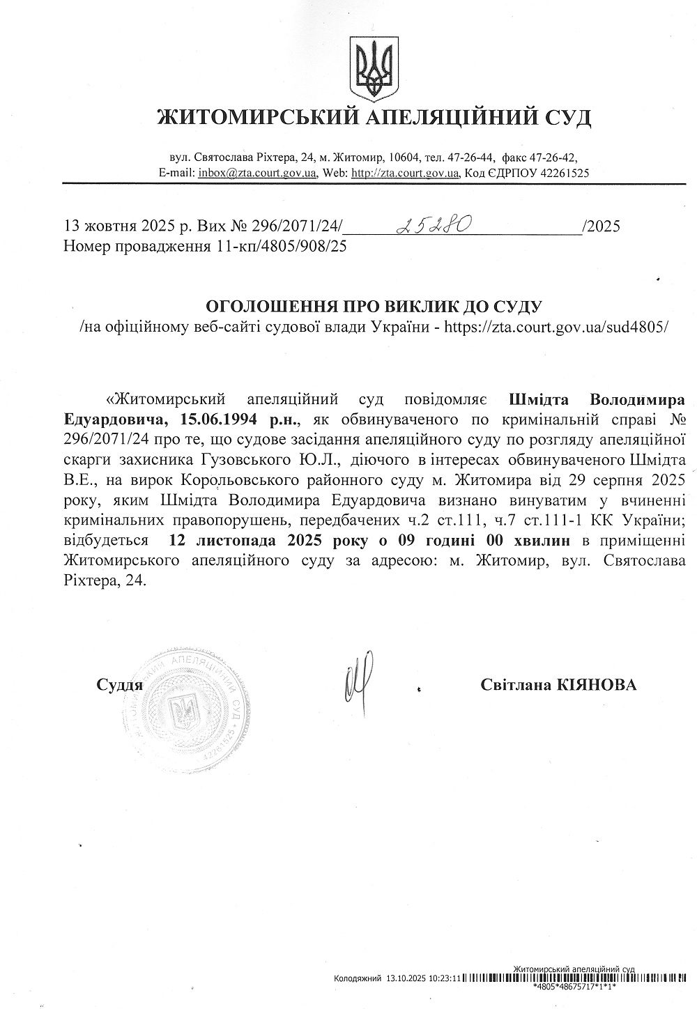 Житомирський апеляційний суд повідомляє про судове засідання по справі №296/2071/24