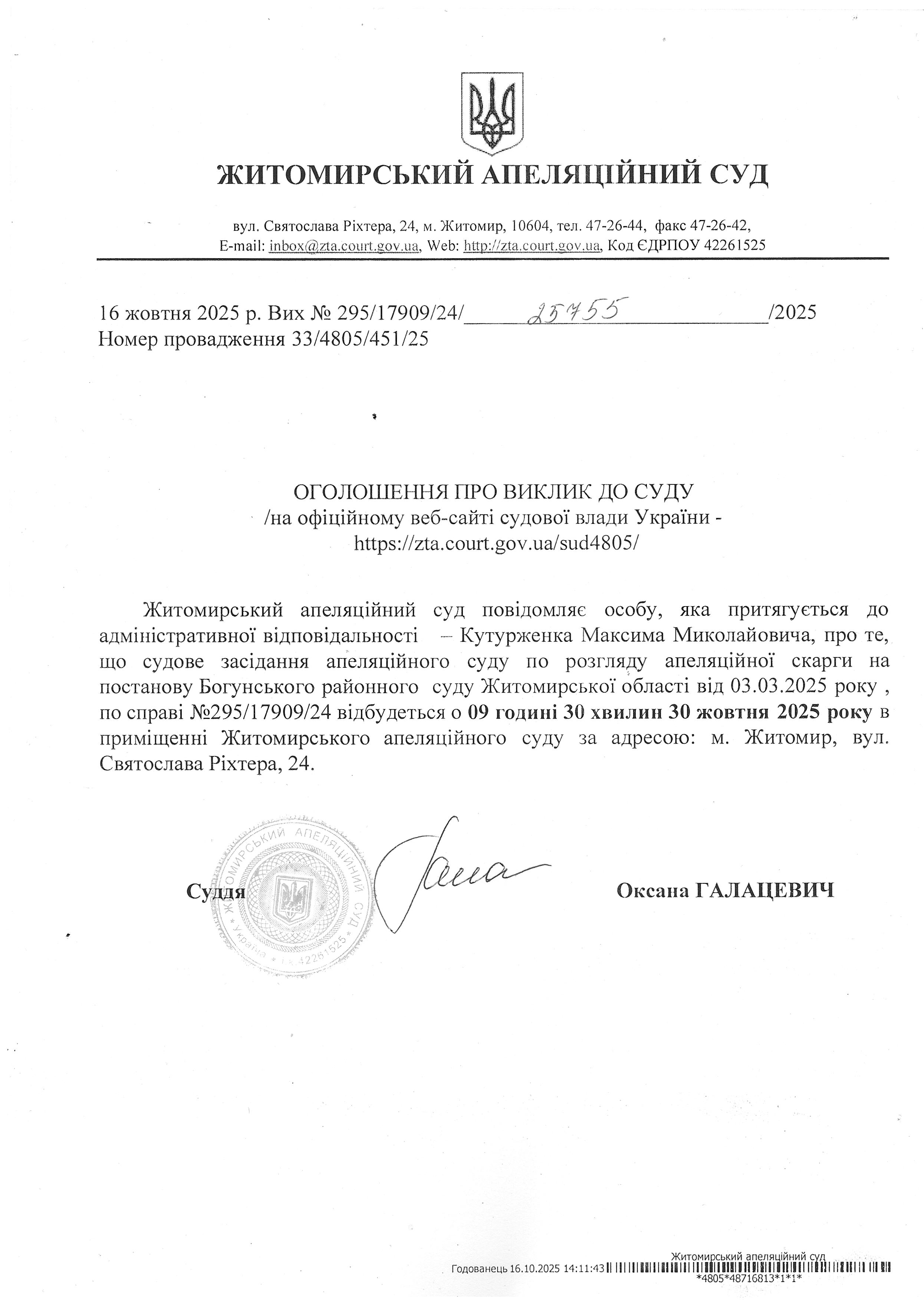 Житомирський апеляційний суд повідомляє про судове засідання по справі № 295/17909/2