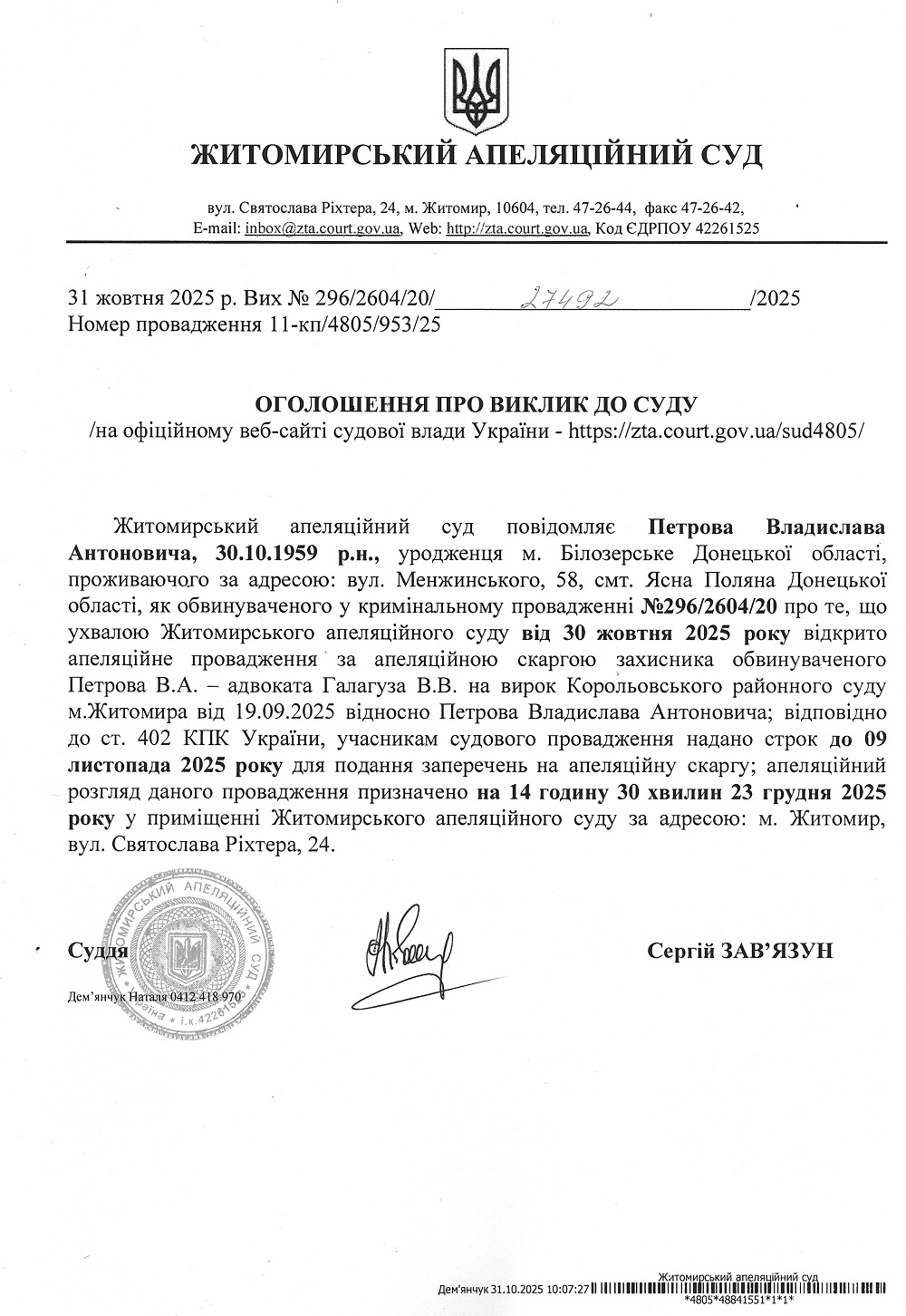 Житомирський апеляційний суд повідомляє про судове засідання по справі № 296/2604/20