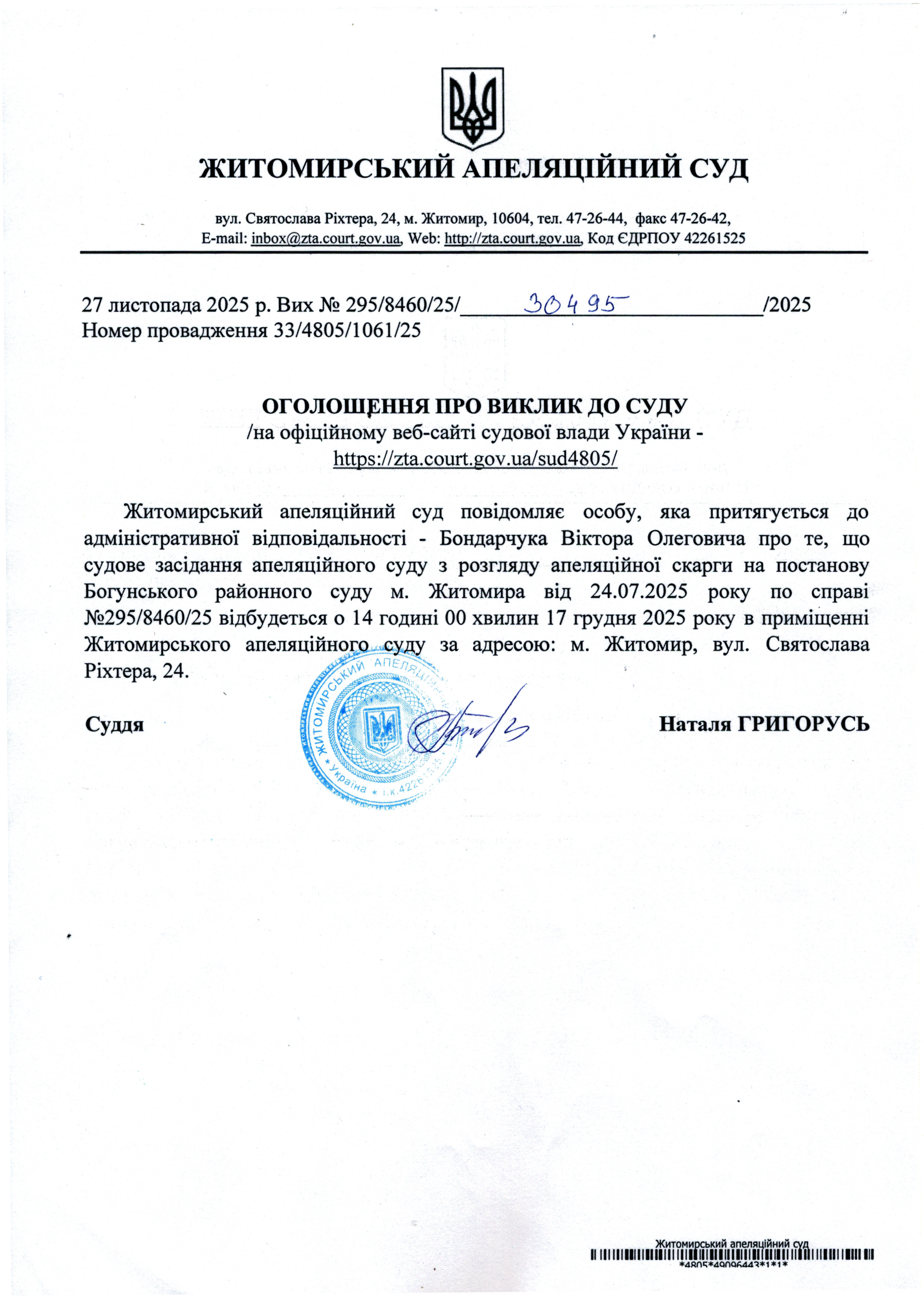 Житомирський апеляційний суд повідомляє про судове засідання по справі № 295/84660/25