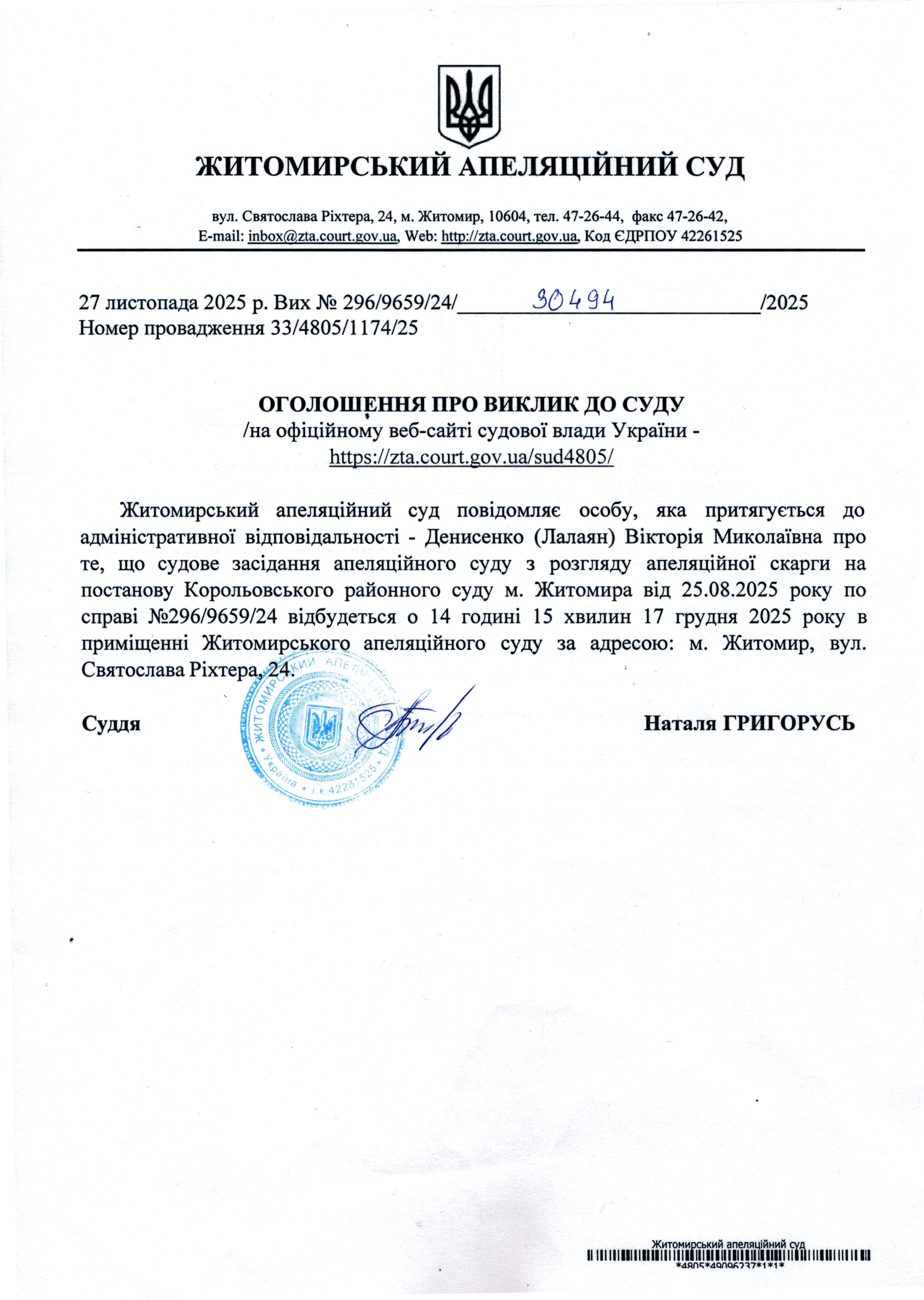 Житомирський апеляційний суд повідомляє про судове засідання по справі № 296/9656/24