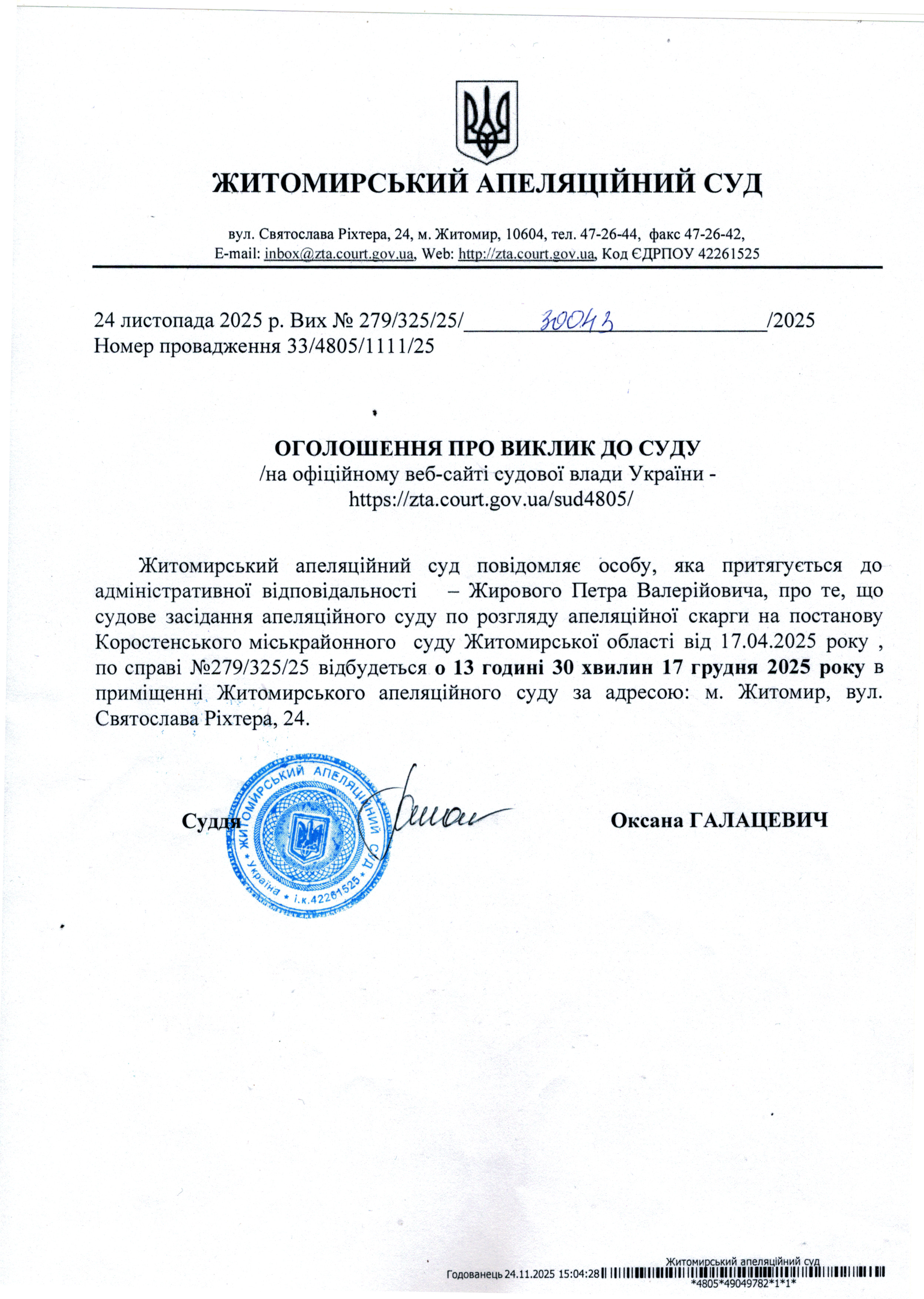 Житомирський апеляційний суд повідомляє про судове засідання по справі № 279/325/25