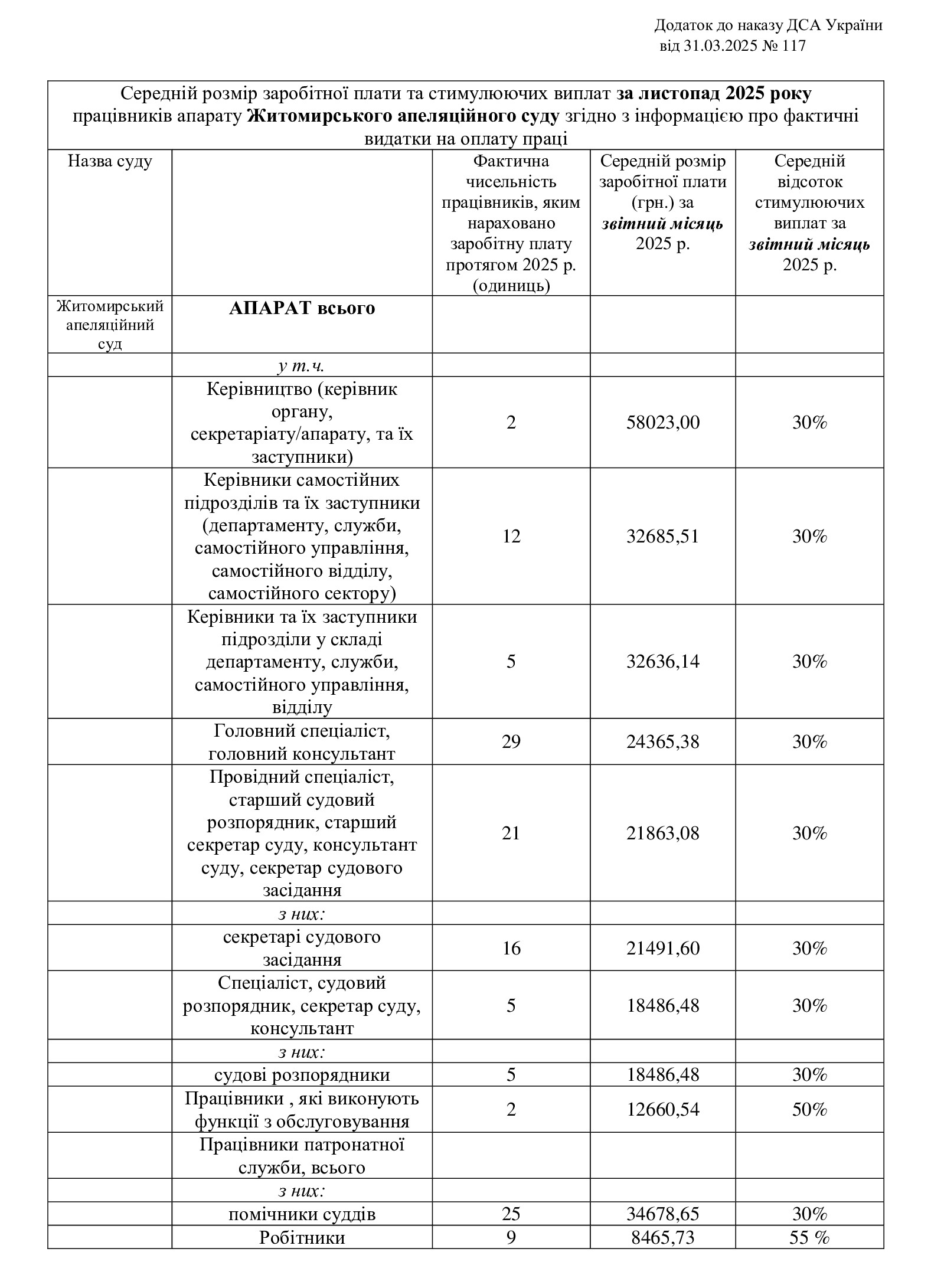 Середній розмір заробітної плати та стимулюючих виплат за листопад 2025 року працівників апарату Житомирського апеляційного суду згідно з інформацією про фактичні видатки на оплату праці