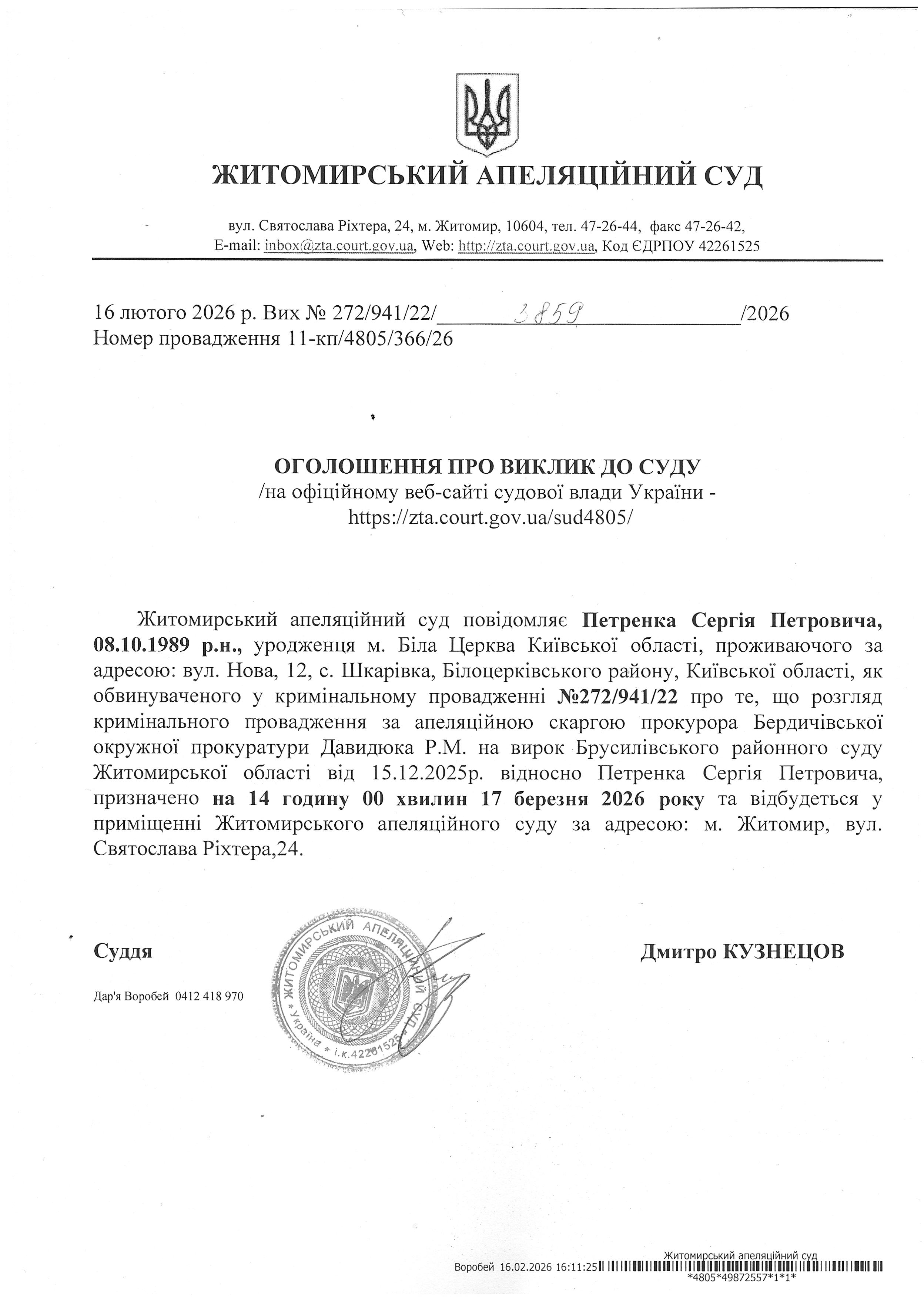 Житомирський апеляційний суд повідомляє про судове засідання по справі №272/941/22