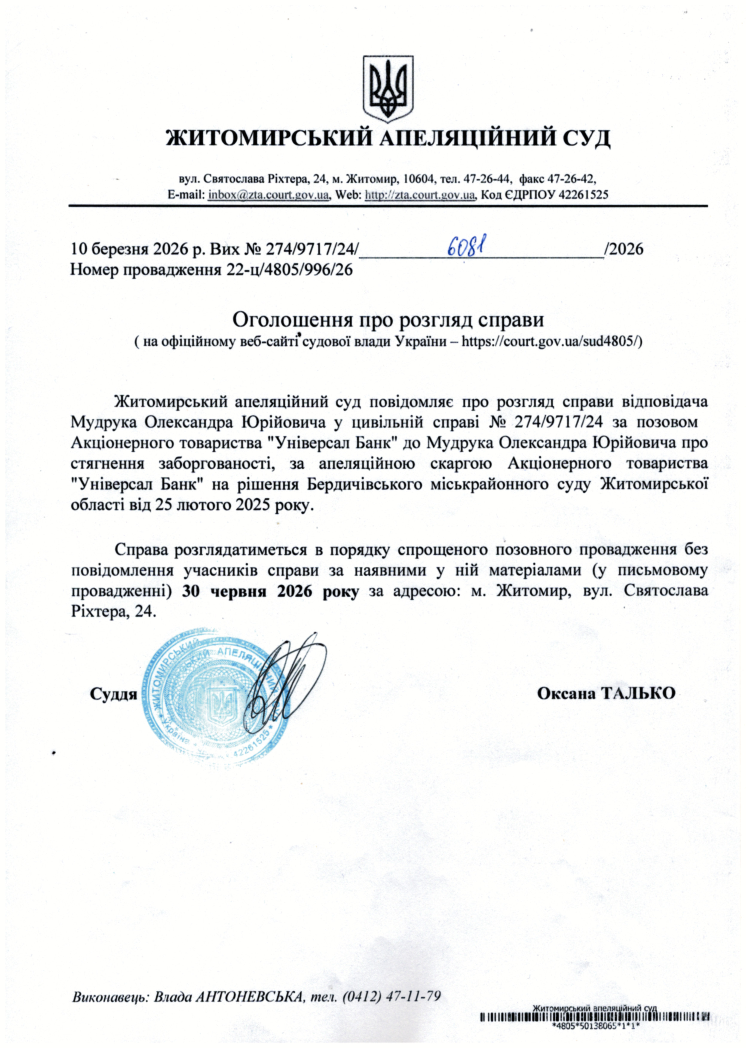 Житомирський апеляційний суд повідомляє про судове засідання по справі № 274/9717/24