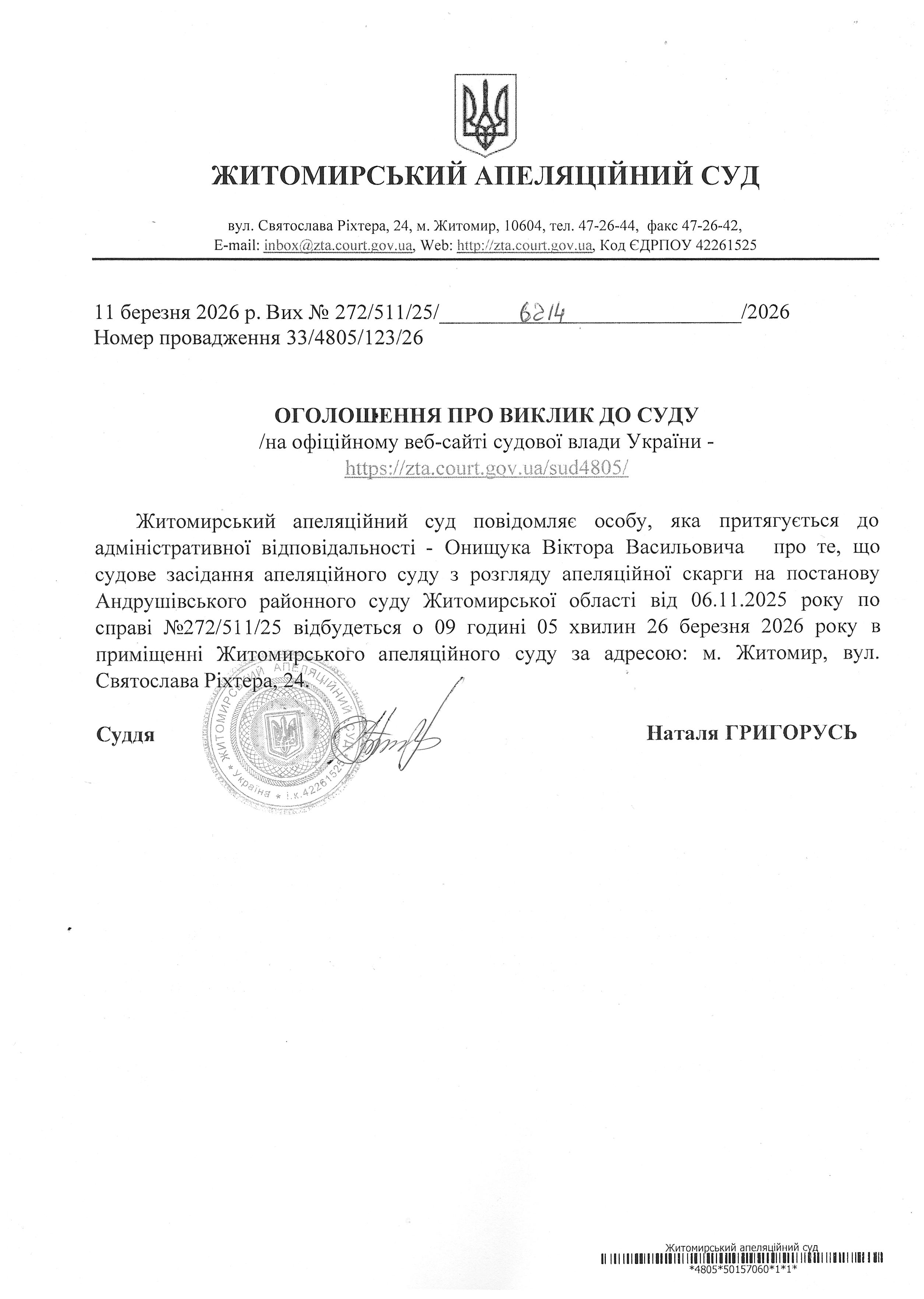 Житомирський апеляційний суд повідомляє про судове засідання по справі №272/511/25