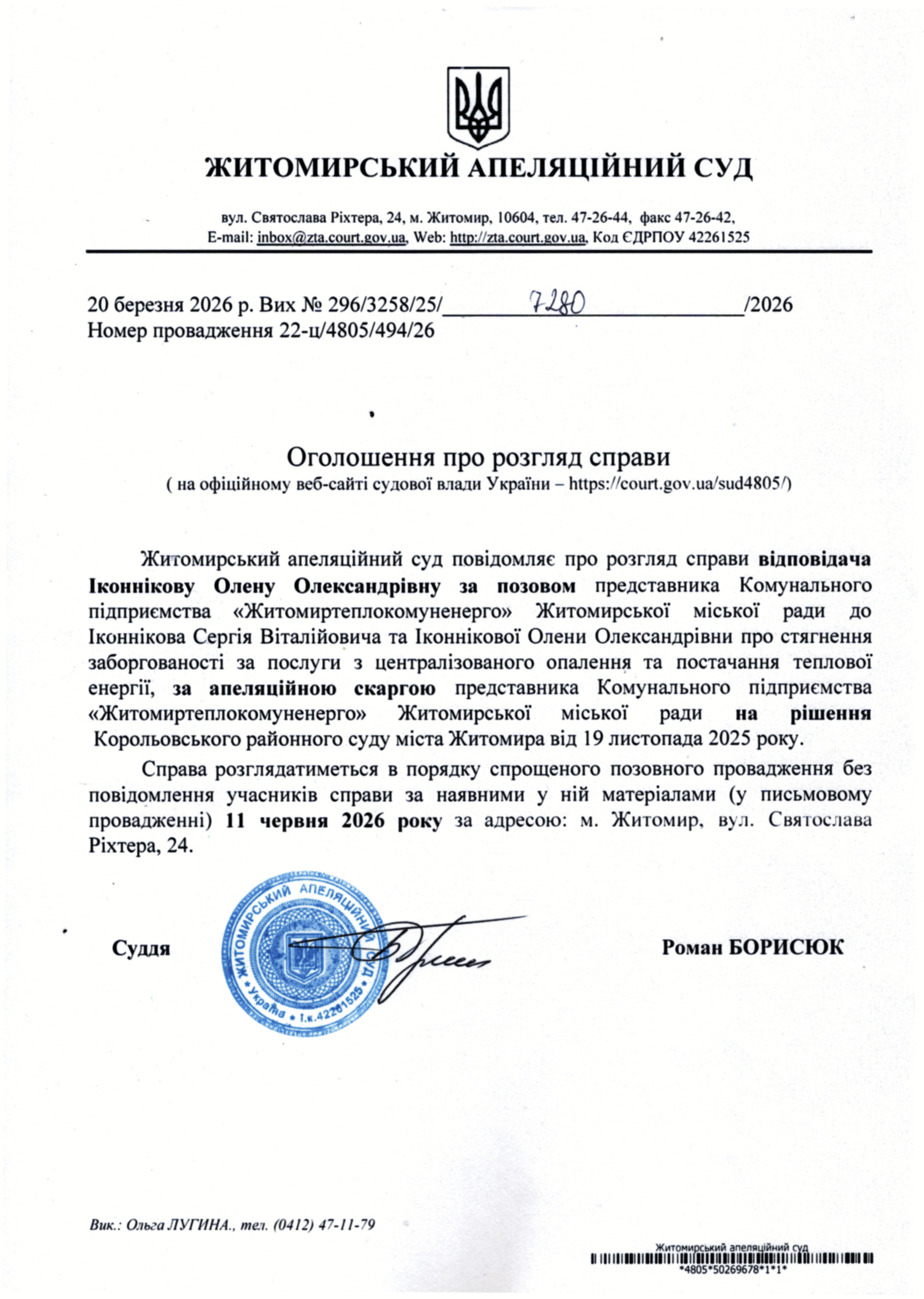 Житомирський апеляційний суд повідомляє про судове засідання по справі № 296/3258/25