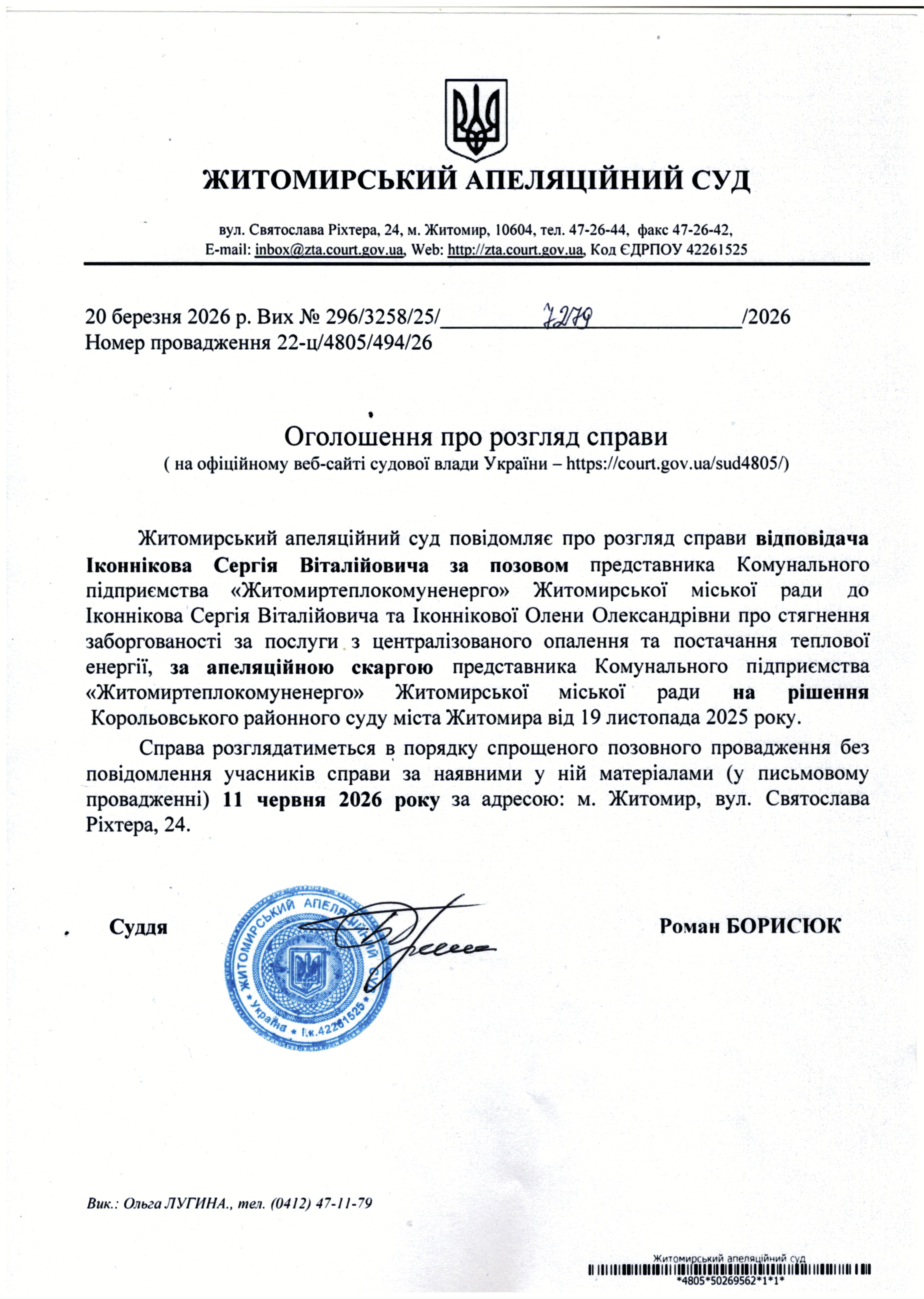 Житомирський апеляційний суд повідомляє про судове засідання по справі № 296/3258/25