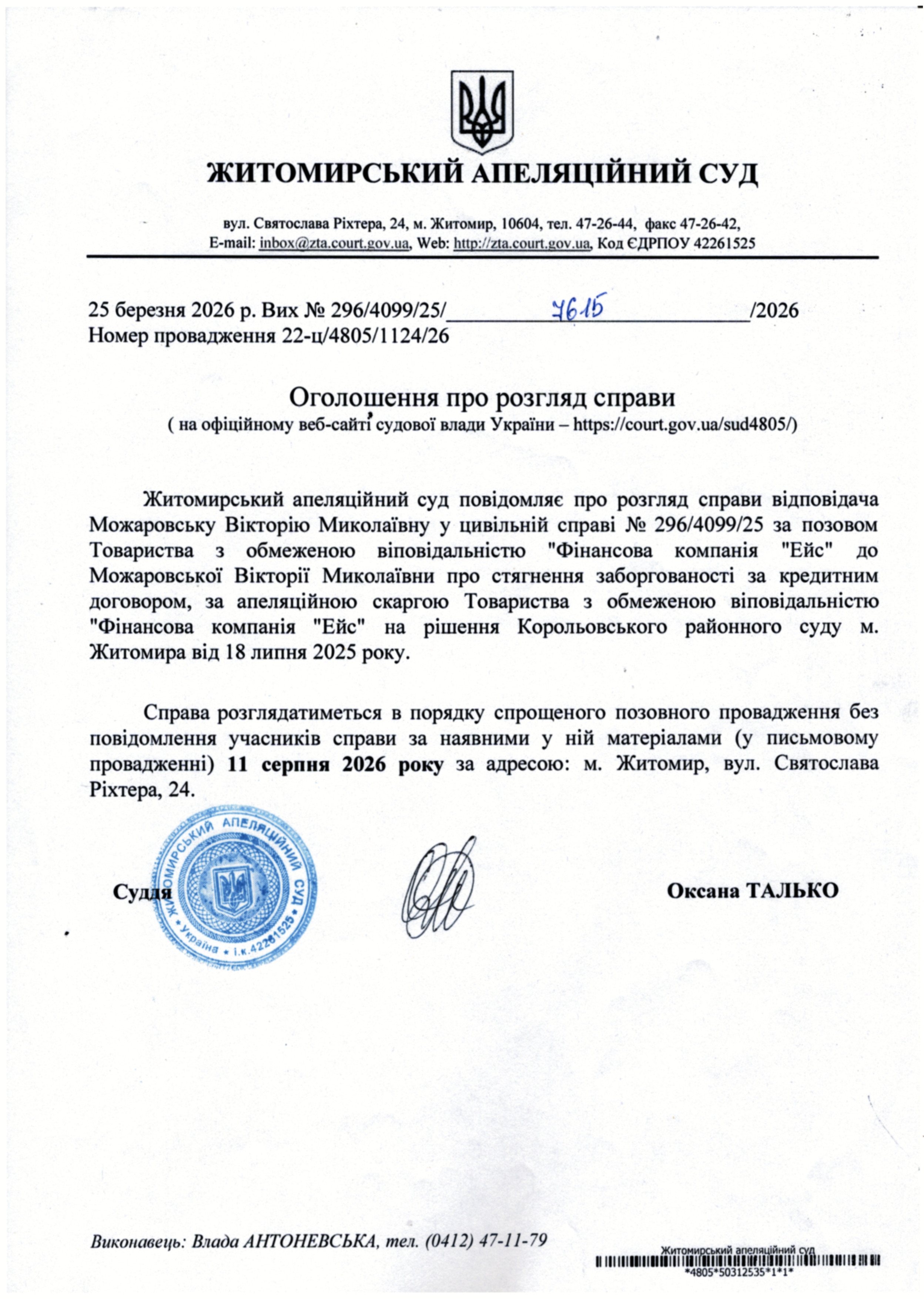 Житомирський апеляційний суд повідомляє про судове засідання по справі № 296/4099/25